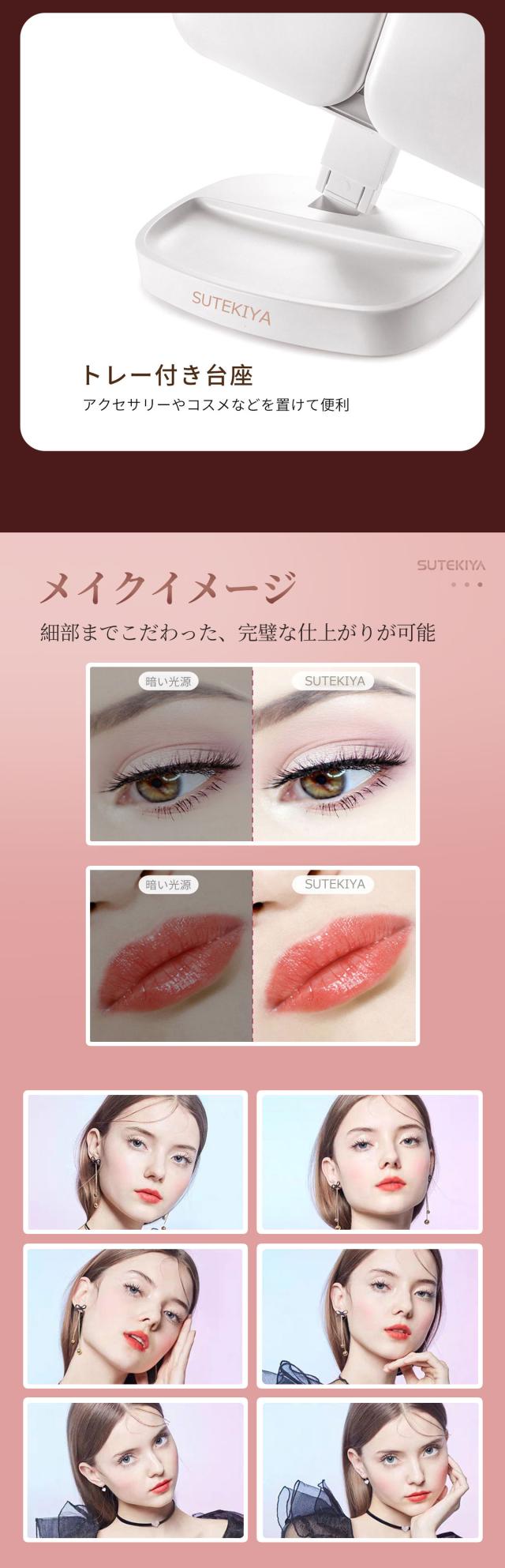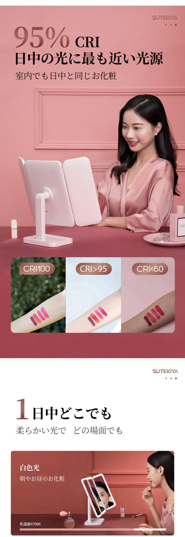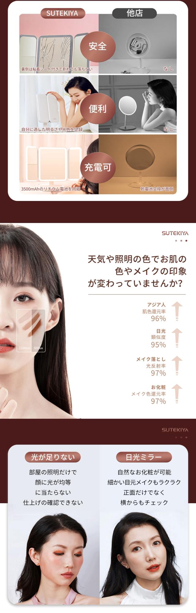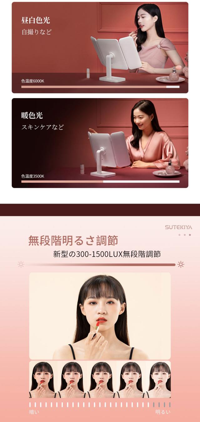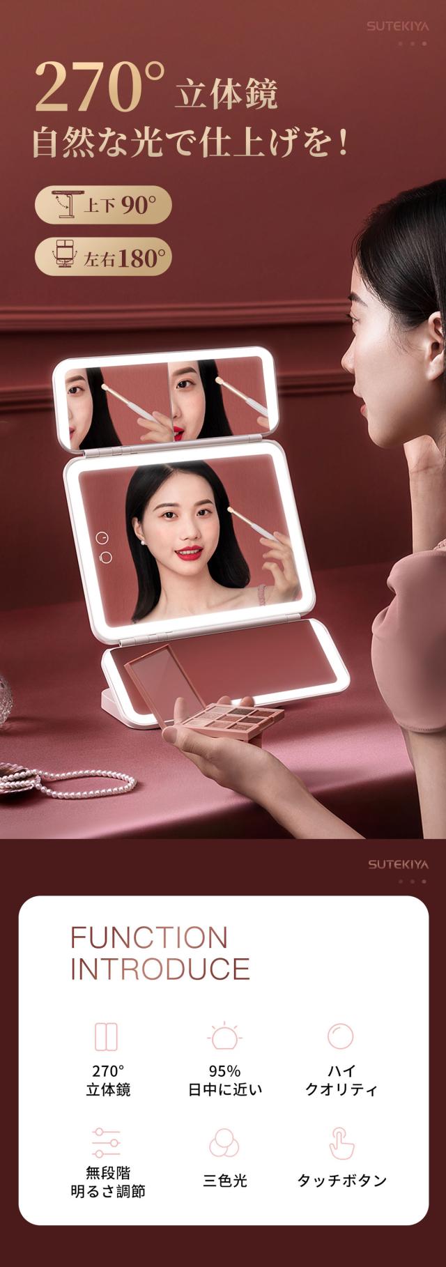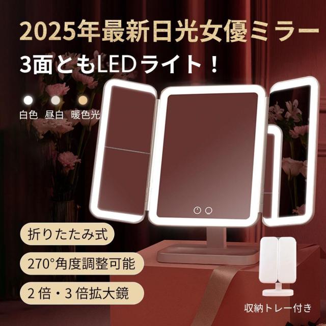【完璧なメイクに必須!】日光ミラー LDEライト 3色 無段階明るさ調整 女優ミラー スタンド 卓上ミラー 三面鏡 おしゃれ ライトミラー 鏡 化粧ミラー 高輝度 ライト 卓上鏡 メイクミラー 化粧鏡 収納トレー 折りたたみ式 記憶機能 1年保証 充電式 卓上ミラー