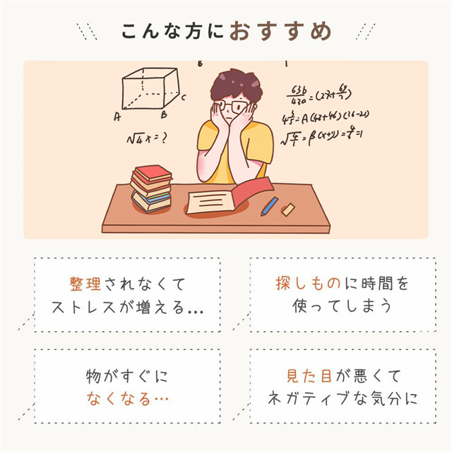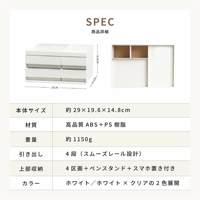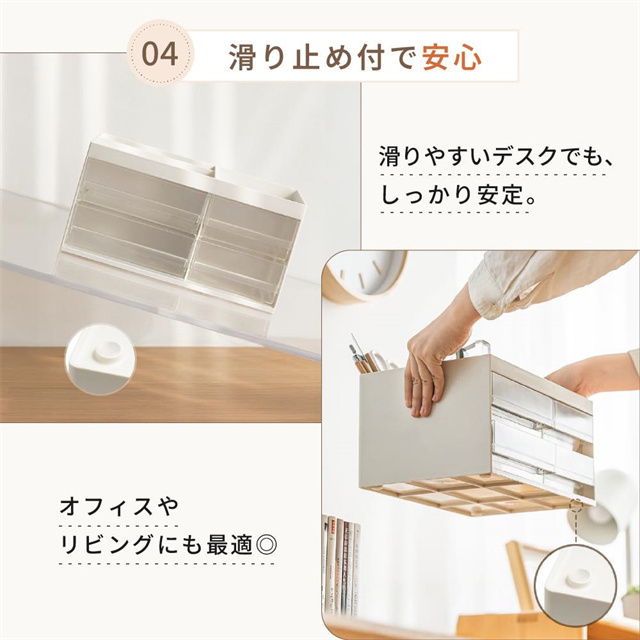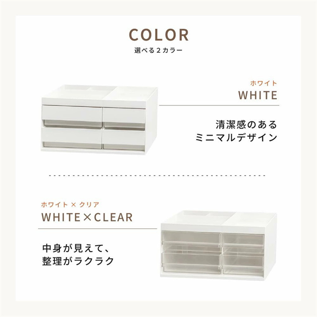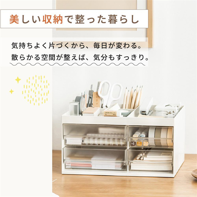 ◆おすすめポイント ・デスク上のごちゃつきが、これ1台ですっきり整います。 ・4段引き出しと上部区画で、使いやすく分類収納可能。 ・A5書類や文具、小物まで幅広く収納できます。 ・作業効率も気分も上がる、快適な空間づくりに最適。 ◆使用用途 ・在宅ワークの文房具整理に。 ・メイク道具や日用品の整頓に。 ・子どもの学習机や、職場デスクにも最適。 ◆カラバリ ・ホワイト:清潔感あるミニマルな印象。 ・ホワイト×クリア:中身が見えて整理がしやすいデザイン。 |