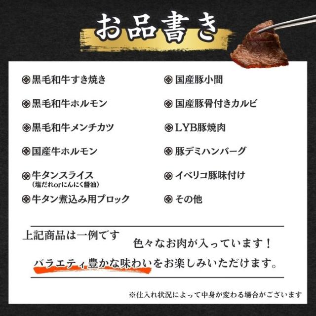 ●4品以上の焼肉、原料肉、加工肉等々バラエティーに富んだ商品を詰合せ致します。