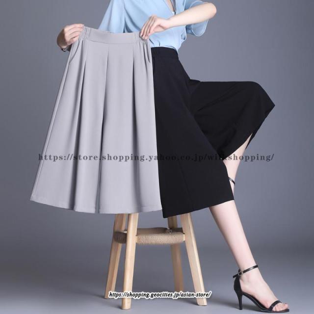 ガウチョ スカーチョ ワイドパンツ レディース ガウチョ 七分丈 五分丈 ウエストゴム きれいめ 黒 灰色 ブルー 夏 シフォン 涼しい ワイドパンツ ウエストゴム