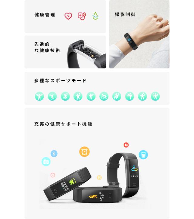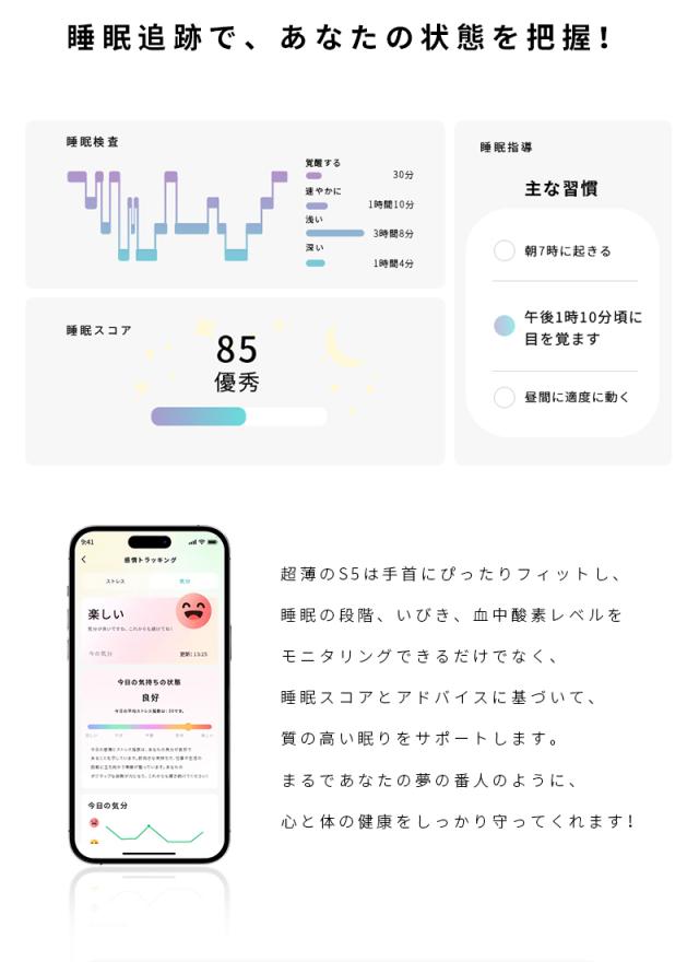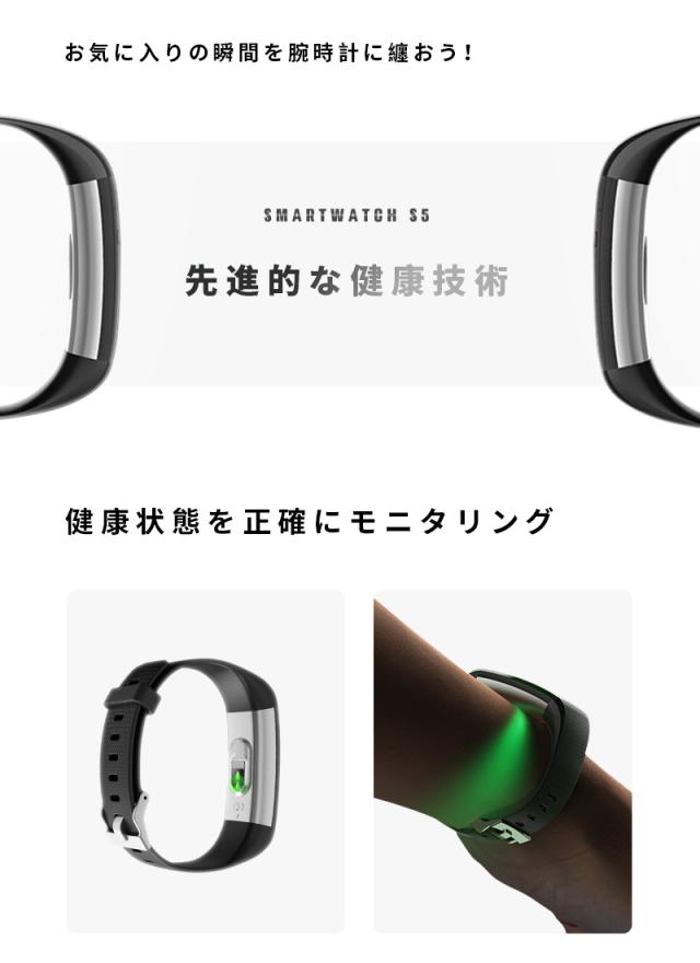 【健康管理にサポート】S5(第2世代)スマートブレスレットは血圧測定、血中酸素測定、温度計測、メッセージ通知、消費カロリー記録、IP68級防水、睡眠モニター、着信案内、座りがち注意、アラーム、心拍数、ランニングの距離、歩数計測など様々な機能を持っています。
