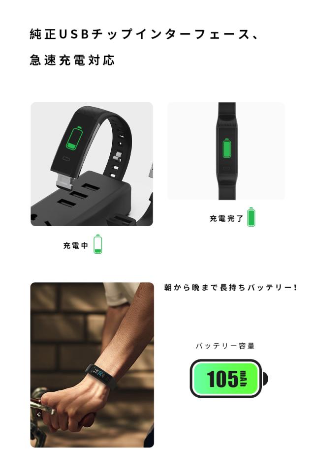【充電方法】バントを外して、USB-Aポートを適用のUSB電源に差し込み、5分充電またはタッチパネルを3秒押して、スマートブレスレットをアクテイブします。USB充電ポートがあれば、スマートブレスレットを充電できますので、専用充電器を用意する必要がありません。