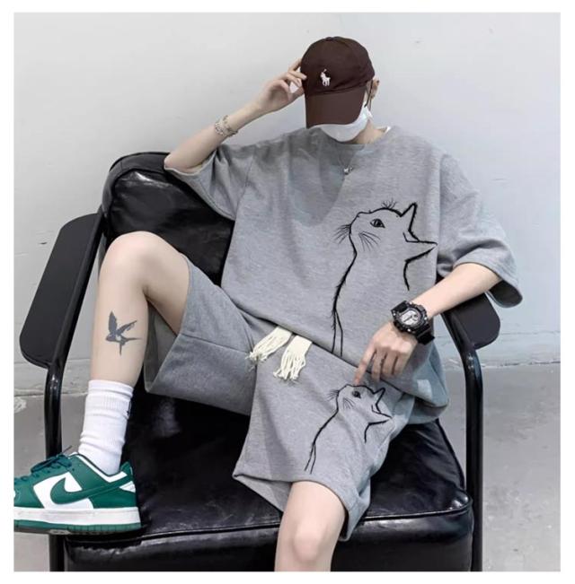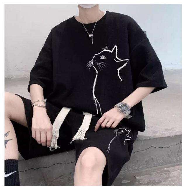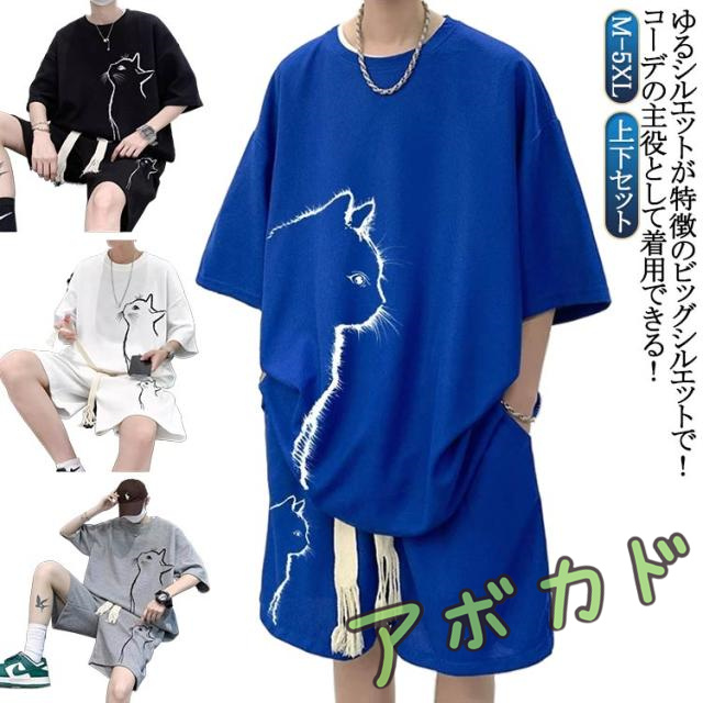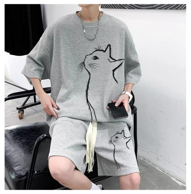 セットアップ メンズ 半袖Tシャツ 夏 カットソー 夏服 オーバーサイズ ハーフパンツ ショートパンツ 猫 半袖 ビッグTシャツ ビッグシルエット 2点セット 上下セット スエード 夏 Tシャツ 夏物 春夏 メンズファッション 韓国
