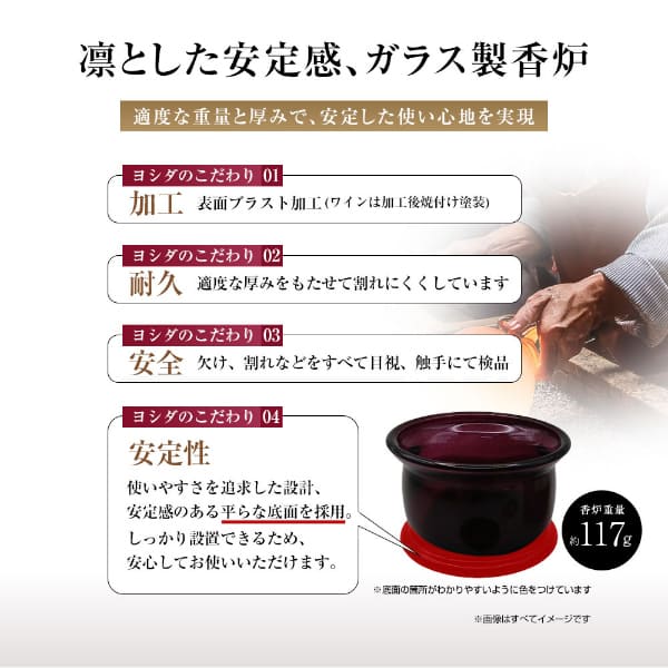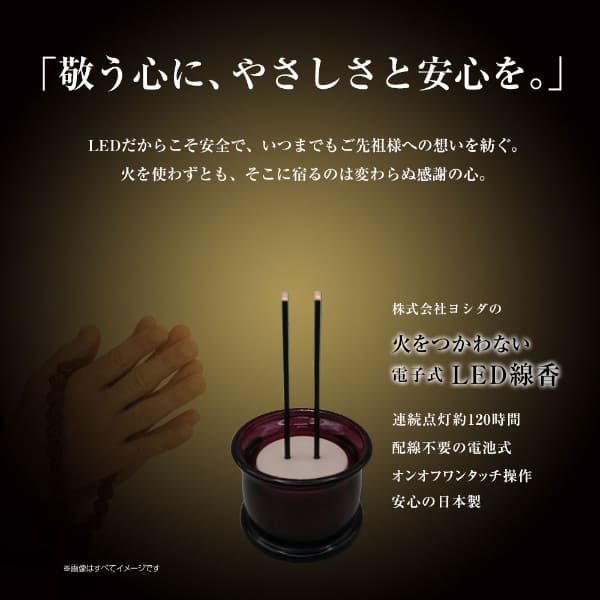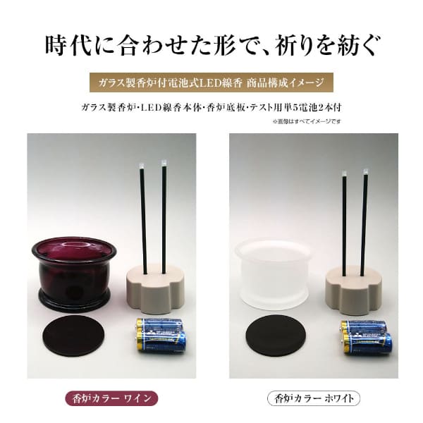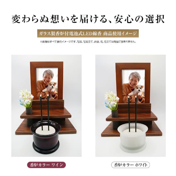 敬う心をつなぐ、やさしさのかたち。LEDだからこそ安全で、いつまでもご先祖様への想いを紡ぐ。火をつかわないLED線香だから、ひとり暮らしのシニアの方、ペットや小さなお子様のいるご家庭でも安心してお使いいただけます。けむりやにおいも出ず、面倒な灰の手入れも必要ありません。ライターやマッチを必要としないLED光源は連続点灯約120時間。配線不要の電池式(単5電池2本使用)。押すだけワンタッチ操作で点灯、消灯が可能。適度な重量と厚みのあるガラス製香炉は使いやすさを追求し、安定感のある平らな底面を採用。70年以上にわたる経験と実績を積み重ねたメーカーが日本国内の工場で一つ一つ、丁寧に手作りしています。日常にとけこむコンパクトなサイズで現代的でモダンなコンパクト仏壇から、伝統的なスタイルの仏壇まで幅広いニーズに対応しています。カラーはシックな存在感のワイン、スタイリッシュな清らかさがあるホワイトの2色からお選びいただけます。