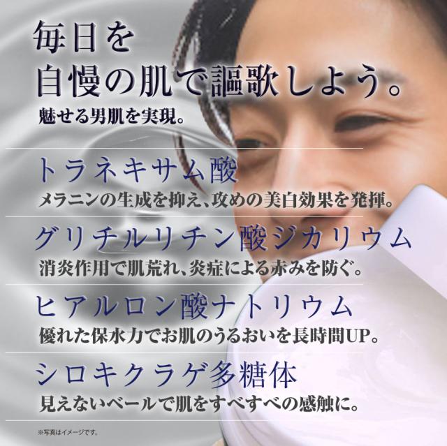 商品詳細: 美白【トラネキサム酸】、肌荒れ防止【グリチルリチン酸ジカリウム】2つの有効成分配合の男性用オールインワン美白クリーム!男性のスキンケアはこれ1つで!