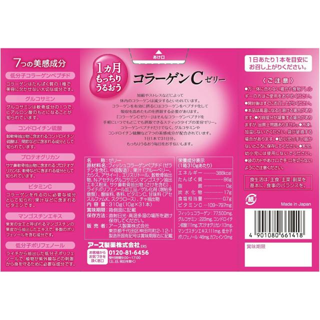 その他成分: (1箱310gあたり)フィッシュコラーゲン:77500mg、グルコサミン:223mg、コンドロイチン硫酸:111mg、プロテオグリカン13mg、マンゴスチンエキス:111mg、低分子ポリフェノール:46mg、カフェイン:0mg