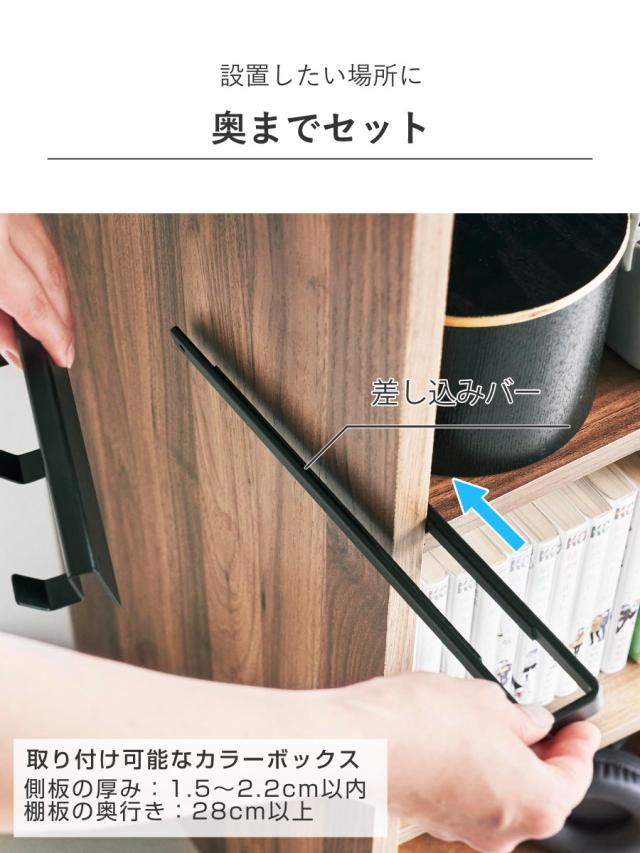 カラーボックスの側板と棚板が接する角の側板側に差し込みバーを奥までセットします。