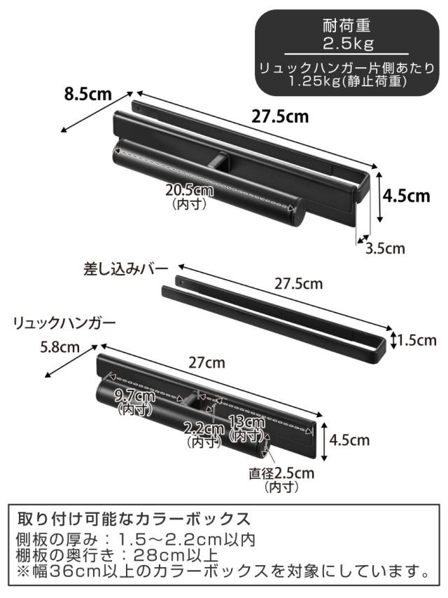 | 耐荷重 | 2.5kg(リュックハンガー片側あたり:1.25kg)(静止荷重) |