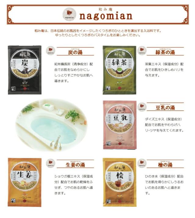 | 内容量 | アロマインバス(aroma in bath Fruit selecton):20g 和み庵(nagomian):20g パルパルポー(PAL PAL PO):20g ハーバルエクストラ(HERBAL EXTRA):20g プチ・フルール(Petit Fleur):20g リッチバスパウダー(Rich Bath Powder):20g ラッキーバス(LUCKY BATH):25g ねむね(nemune):20g リフール(Re・f:l):20g (すべて各1回分) |