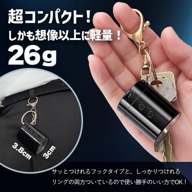 わずか約26g、サイズは約3cm四方と超小型。ポケットやバッグに入れてもかさばらず、キーホルダーとして違和感なし。毎日の携帯に最適です。