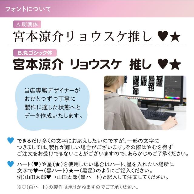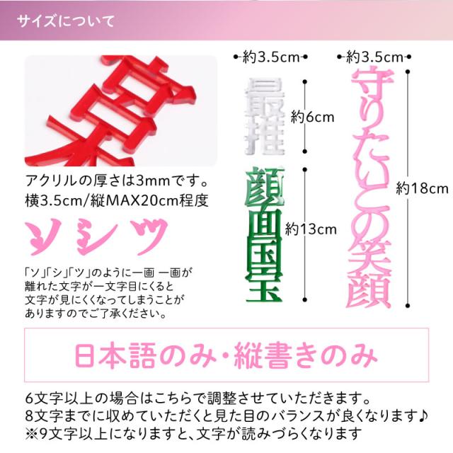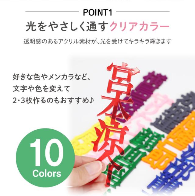 お気に入りの名前やフレーズを、 透明感あふれるアクリルプレートに。 本商品は、アクリル板から文字をくり抜いてつくる ネームプレートです。 ぬいぐるみや推しのアイテムと一緒に並べれば、 おしゃれなディスプレイや写真撮影にぴったり。 日常の記録やイベントシーンも、特別な一枚に仕上がります。 繊細なアクリルを使用しているため、 梱包には細心の注意を払ってお届けします。 どうぞ、推しと同じように大切に扱ってくださいませ。 - 名前やワードをくり抜いてつくるアクリルネームプレート - ぬいぐるみやお気に入りグッズと一緒に飾れる? - 撮影小物としても映える、写真にぴったりのサイズ感 - 全10色のカラーバリエーション(担当カラーも◎) - 高品質アクリル素材ならではのツヤと透明感 - 国内工房で丁寧に製作、仕上がりにこだわりました - 繊細な商品だからこそ、丁寧に梱包してお届け - 名前やワードの名入れ対応(漢字・ひらがな・カタカナ) |