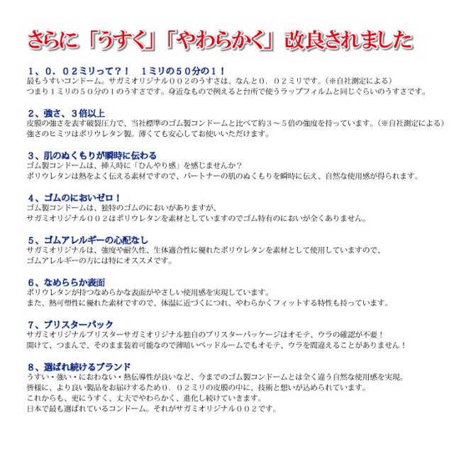 ● 従来のゴム製でなく、体にやさしいポリウレタン素材● 0.02ミリのうすさを実現しています(メーカー測定)● 強さ、ゴム製コンドームの3倍以上(メーカー測定)● ゴム特有のにおいが全くない● 肌のぬくもりを瞬時に伝える優れた熱伝導性● なめらかな表面が自然な使用感を実現● 透明度が高く視覚的にも自然● 天然ゴムアレルギーの方にもお勧めです● 10年の長い使用期限(ゴムは5年)