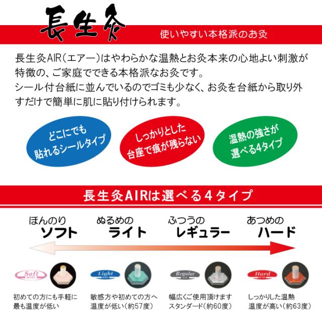 ● 長生灸AIR(ちょうせいきゅえあー)は、やわらかな温熱とお灸本来の心地よい刺激が特徴のご家庭でできる本格的なお灸です。シール付台紙に並んでいるのでゴミも少なく、お級を台紙から取り外すだけで簡単に肌に貼り付けられます。● ご使用方法は、台紙からはずし、肌に貼り付けるだけです。 接着面が広く、強力な粘着力で、お灸が落下する心配がありません。