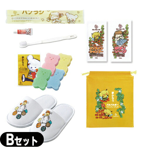 【ホテルアメニティ】業務用 パルパルポー(PAL PAL・PO) 子供用 アメニティセットB (歯ブラシ・スポンジ(色選択不可)・ボディーソープ・リンスインシャンプー・スリッパ・バッグ)