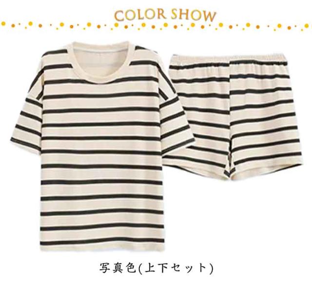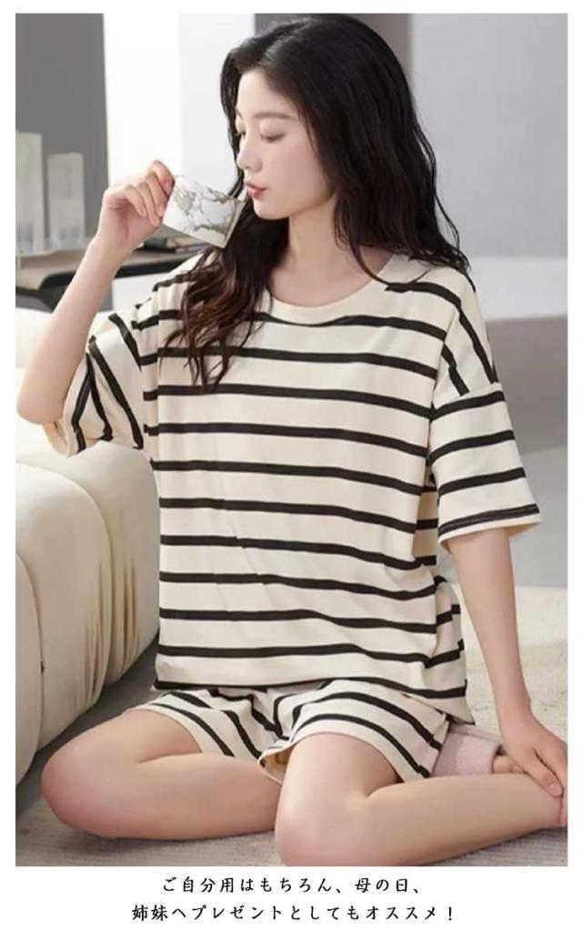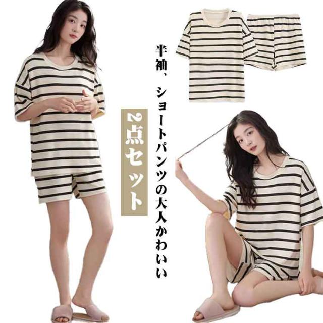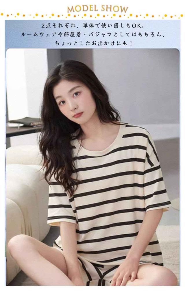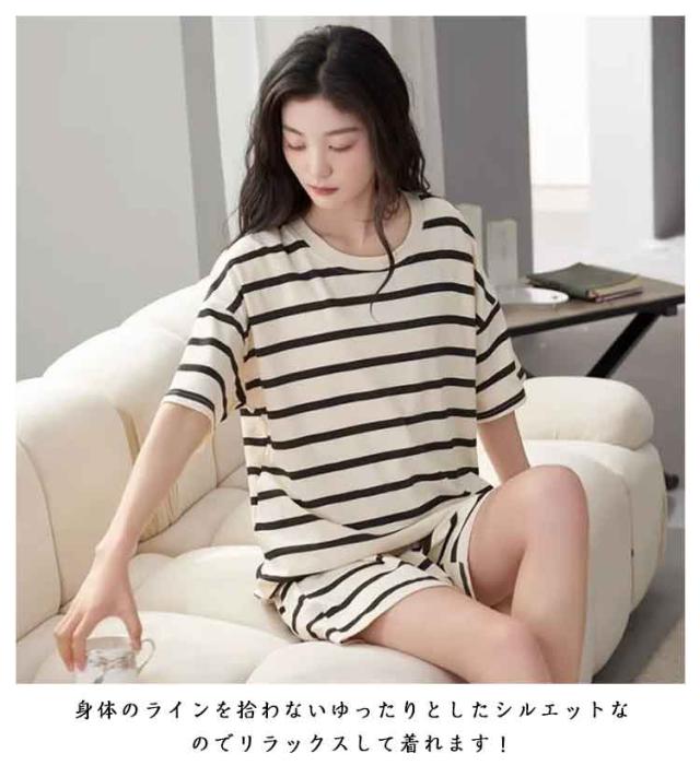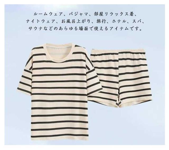 上下セット レディース パジャマ 夏用 カップ付き ボーダー柄 短パン ショートパンツ 半袖 ルームウェア クールネック 短ズボン リラックス 部屋着 ゆったり 大きいサイズ 無地 セットアップ シンプル おしゃれ カジュアル 可愛い