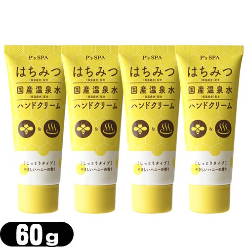 【ハニーハンドクリーム】P’s SPA はちみつ+国産温泉水ハンドクリーム (しっとりタイプ) 60g ×4個セット - ほんのり甘いやさしいハニーの香りとうるおうのにべたつかないさらりとした使い心地