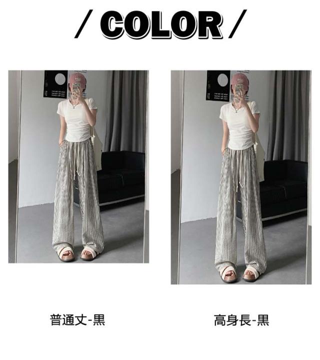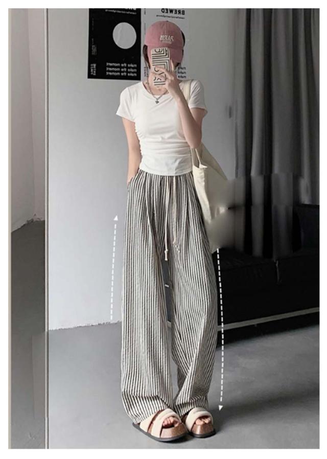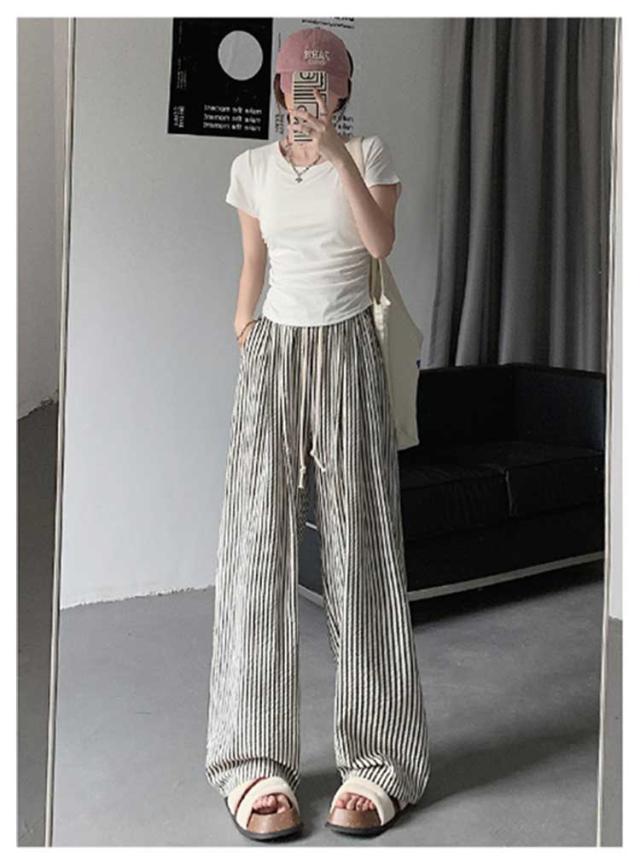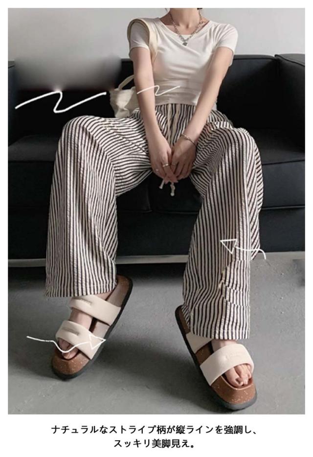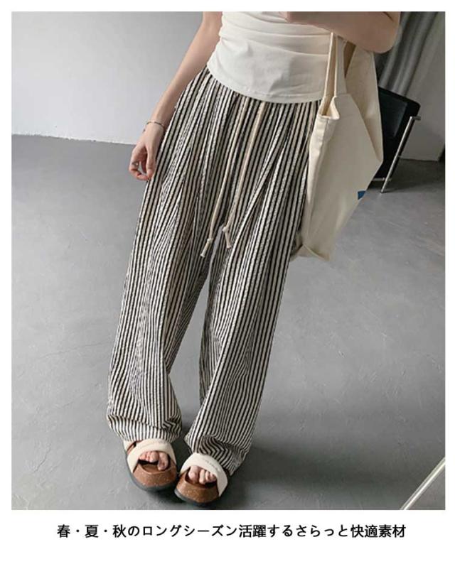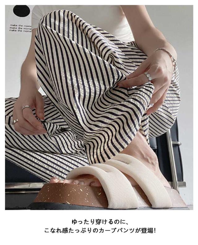 ストライプ ワイドパンツ レディース カーブパンツ 春 夏 秋 ハイウエスト ゆったり ストレートパンツ カジュアル 着痩せ ロングパンツ 高身長 長ズボン ボトムス ウエストゴム 大きいサイズ コクーンパンツ おしゃれ