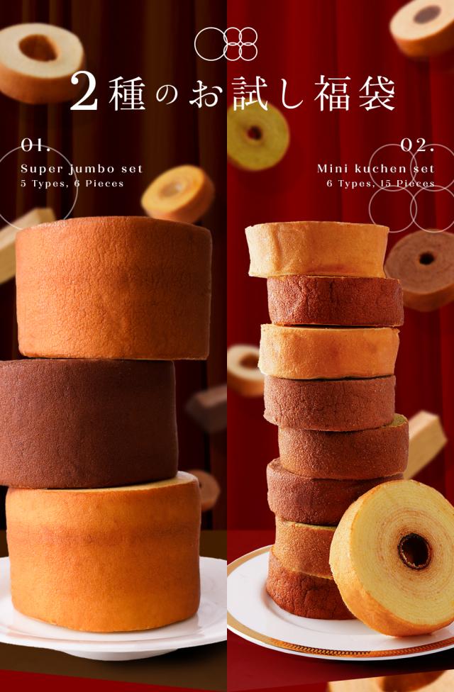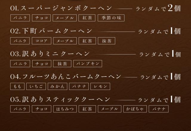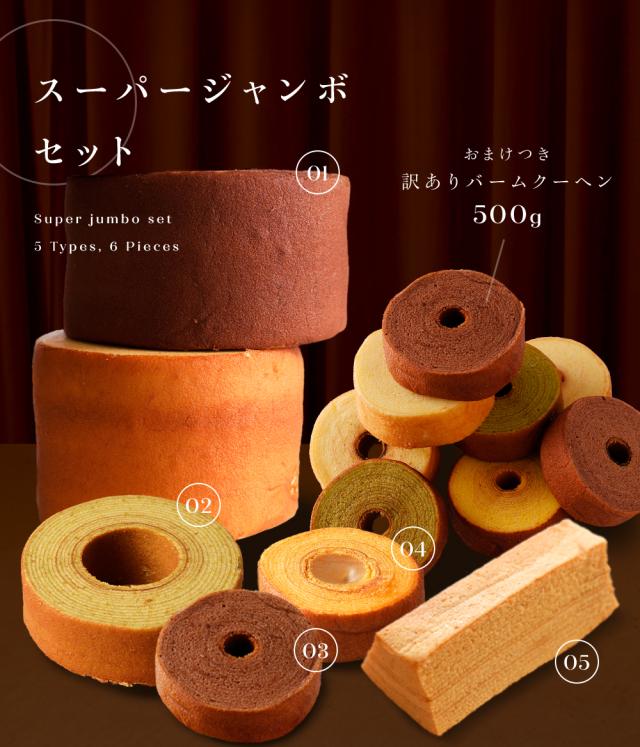 スーパージャンボクーヘン×2、下町バームクーヘン×1、ミニクーヘン×1、スティッククーヘン×1、フルーツあんこバームクーヘン×1