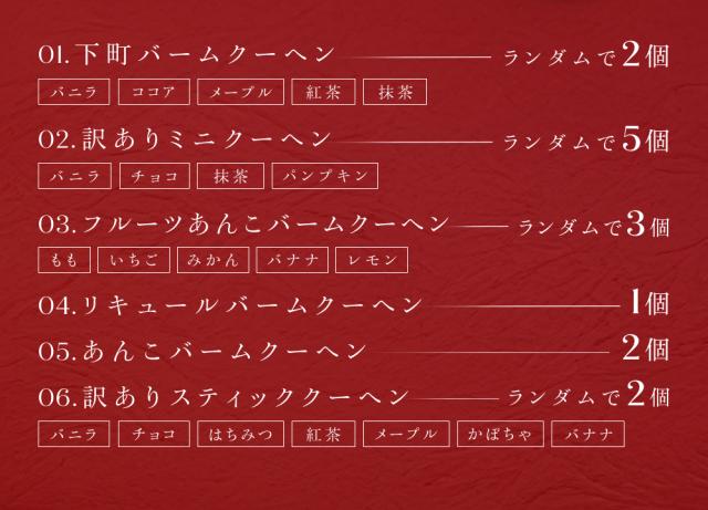 下町バームクーヘン×2、ミニクーヘン×5、スティッククーヘン×2、フルーツあんこバームクーヘン×3、リキュールバームクーヘン×1、あんこバームクーヘン×2