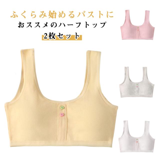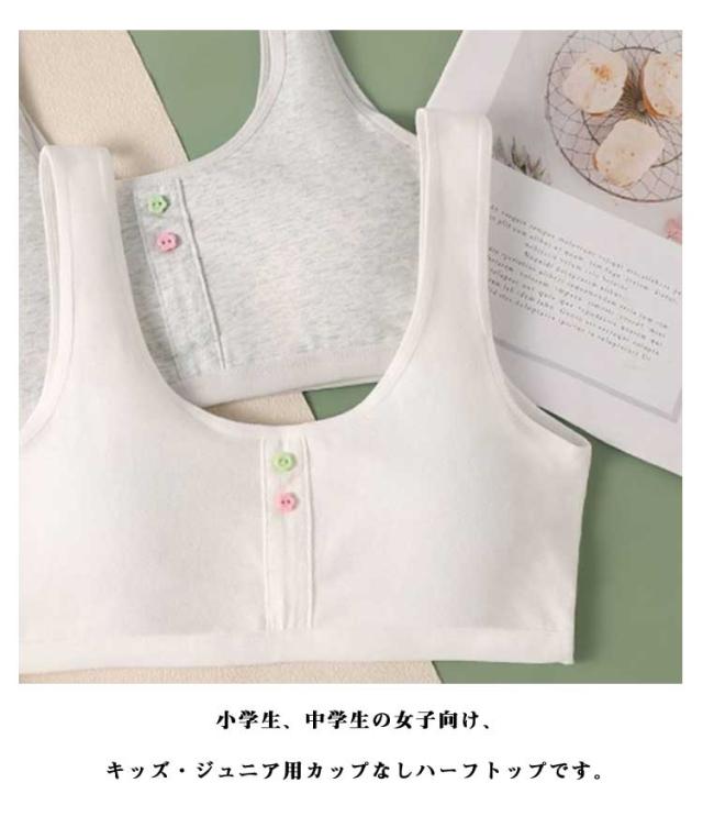 | ふくらみ始めるバストにおススメのハーフトップ 伸縮性・通気性にも優れていますので大変嬉しいアイテムです ふんわりとした質感の気持ちいい着心地で運動時もストレスフリー。 小学生、中学生の女子向け、キッズ・ジュニア用カップなしハーフトップです。 体への負担が少ないので運動・部活・スポーツ・ダンス・普段着・睡眠時など非常に快適に過ごすことができるでしょう。 春夏秋冬、季節や流行りを問わず1年中を通して長くお使いいただける商品になっております | |
