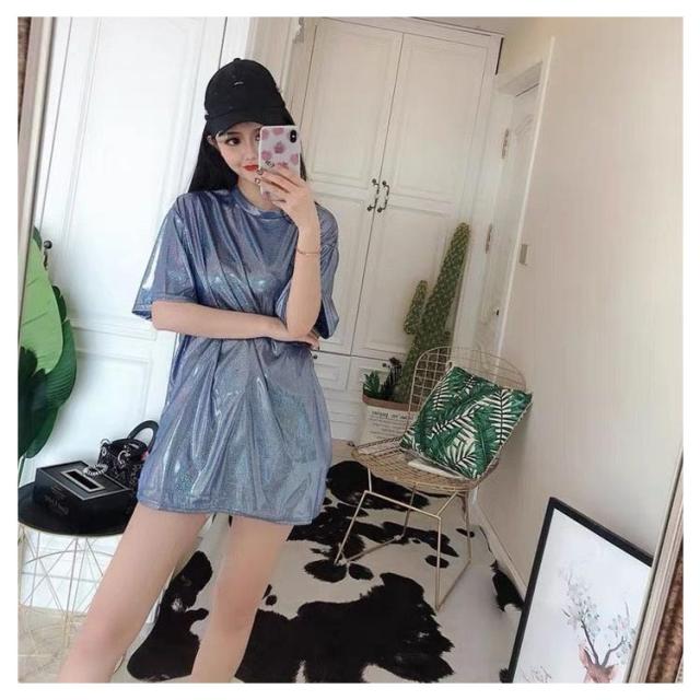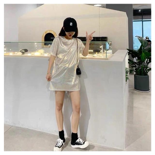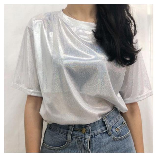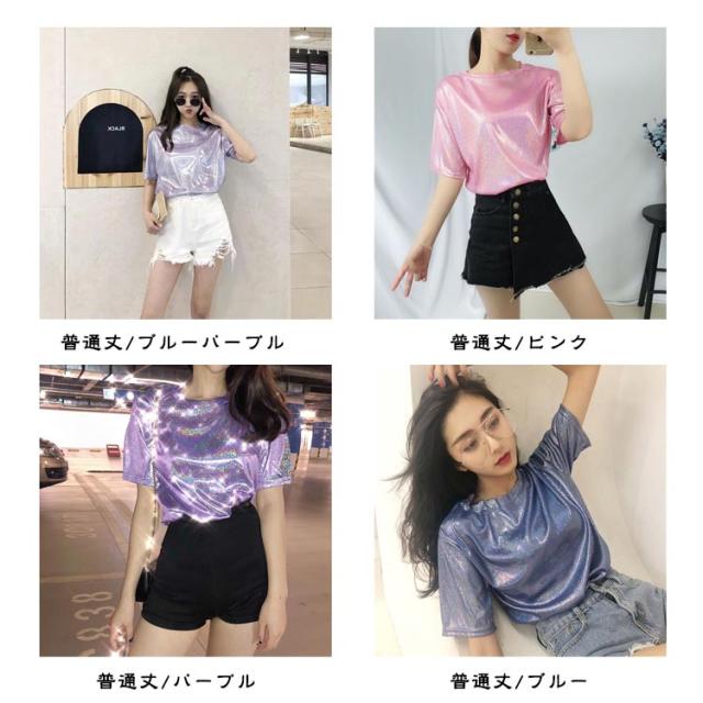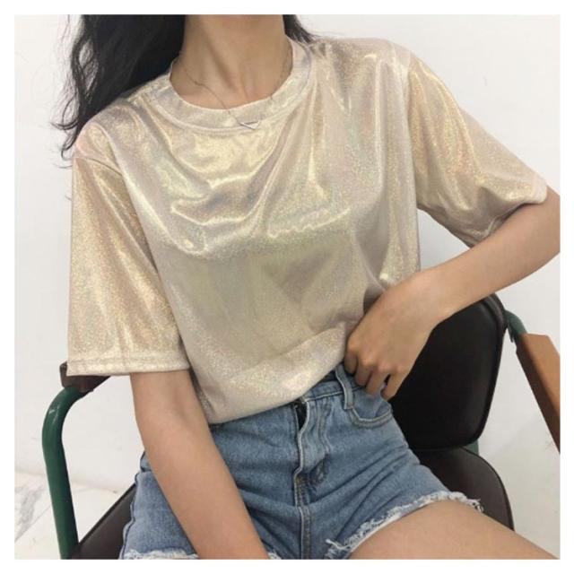 | キラキラ反射のラメ素材Tシャツ 蒸れ感もなく、サラッと軽く薄く着心地良い。 普段使いにはもちろん、ダンス・ステージ衣装にもピッタリ! ショートパンツやホットパンツなどと合わせやすい。 メリハリのあるシルエットが女性らしさを醸し出す一着。 | |