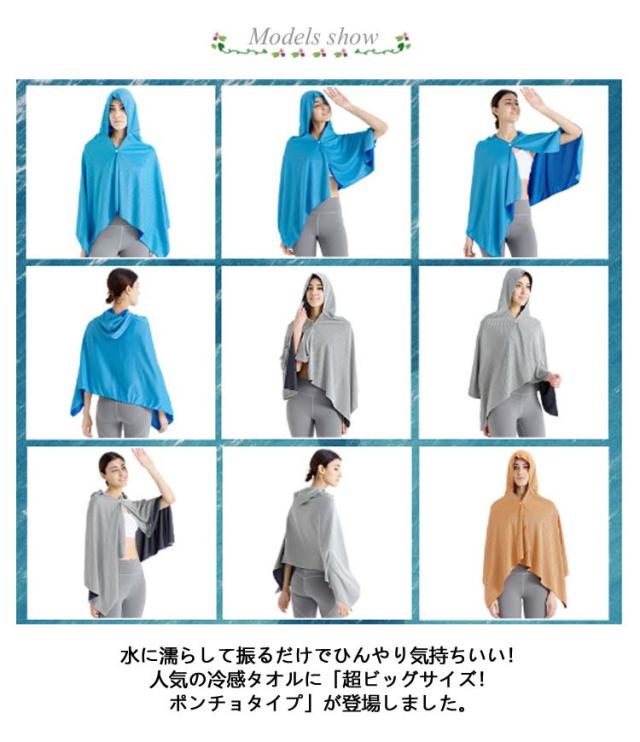 | 夏の暑さ対策、熱中症対策に! 吸水速乾・日焼け止め 冷感ポンチョ 【収納ポーチ】 水に濡らして振るだけでひんやり気持ちいい!人気の冷感タオルに「超ビッグサイズ!ポンチョタイプ」が登場しました。 冷感タオルと同様の特殊冷感生地を使用。気化熱の作用で「ぬらす→しぼる→振る」だけですばやく冷たさを感じることが出来ます。 水でも汗でも効果を発揮!生地に水分が含まれていれば、振るだけで何度でも冷たさが復活します。洗濯機で洗えるので衛生的です。 ポンチョタイプは、一般的な冷感タオルの約3.5倍の大きさなので、長時間冷たさ持続! 炎天下が避けられない状況の仕事や作業、待機時間の長い部活、スポーツ観戦、フェスなど様々なシーンで活躍します。 炎天下が避けられない状況の仕事や作業に ・待機時間の長い部活や習い事に ・屋外でのスポーツ観戦に ・フェスやライブなどの音楽イベントに ・室内での家事に ・節電対策に 効果的な使い方 STEP1:ぬらす 本体にしっかり吸水させてください。 STEP2:しぼる 水が滴らない程度に軽くしぼってください。 STEP3:ふる 数回強く振ってください。生地温度が低下し、冷たくなります。冷たくなくなったら、STEP1〜3を繰り返してください。 ※ポンチョタイプは大きいので、しぼりにくい場合は少しずつしぼってください。 ※STEP3でタオルを振る際は、周囲に人がいないか確認してください。 | |