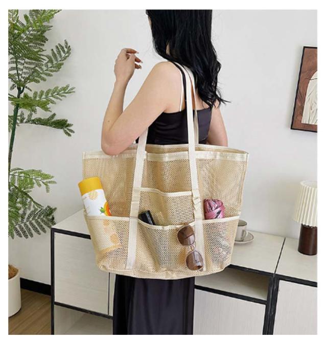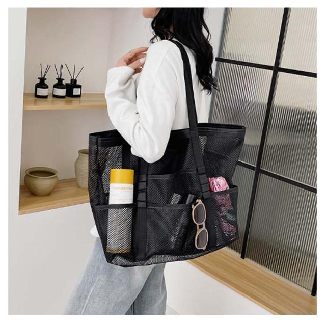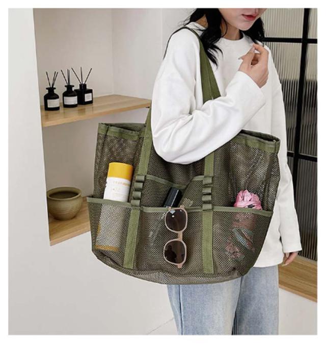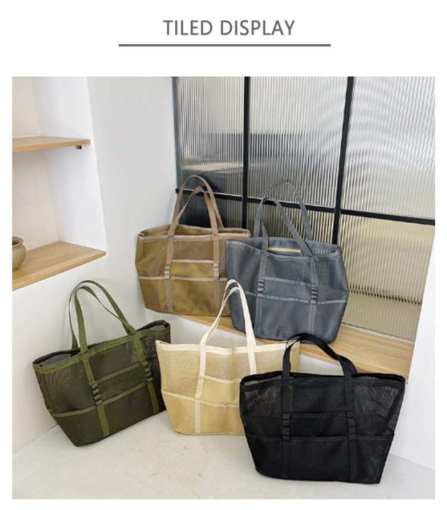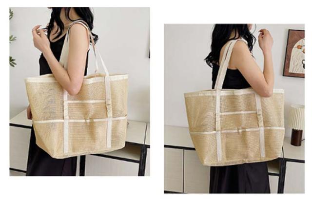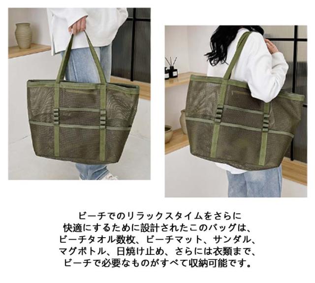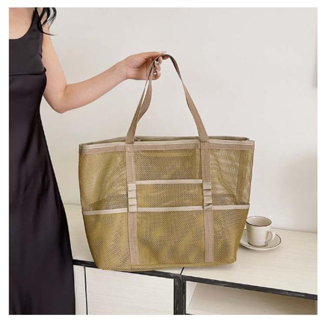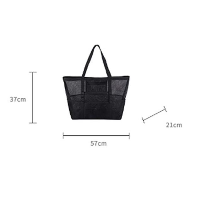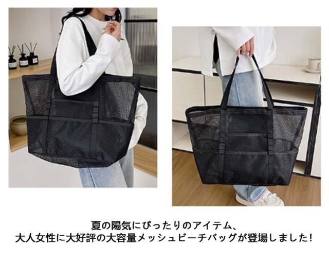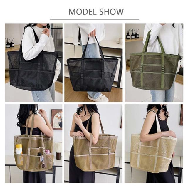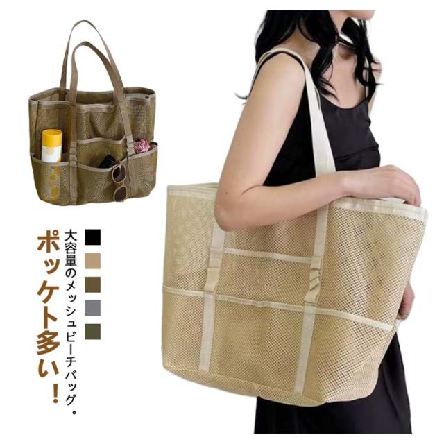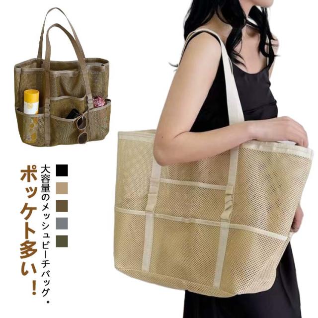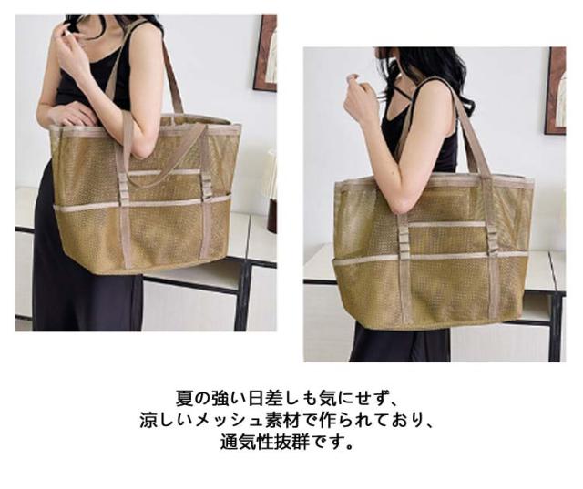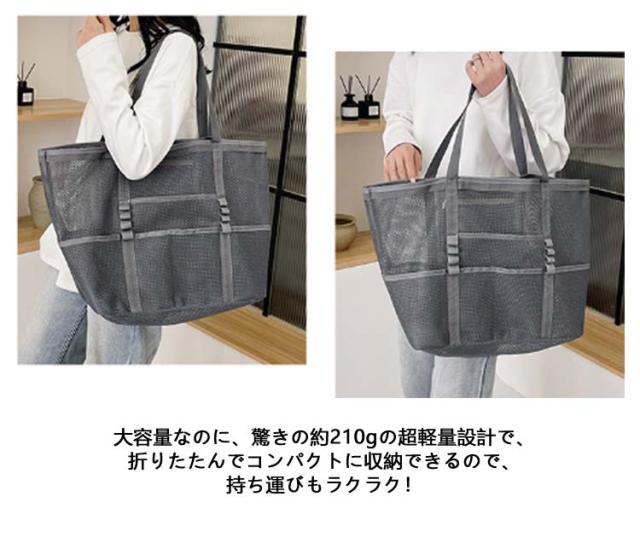 | 大容量のメッシュビーチバッグ。ポッケト多い!夏の陽気にぴったりのアイテム、大人女性に大好評の大容量メッシュビーチバッグが登場しました! ビーチでのリラックスタイムをさらに快適にするために設計されたこのバッグは、ビーチタオル数枚、ビーチマット、サンダル、マグボトル、日焼け止め、さらには衣類まで、ビーチで必要なものがすべて収納可能です。 大容量なのに、驚きの約210gの超軽量設計で、折りたたんでコンパクトに収納できるので、持ち運びもラクラク! 夏の強い日差しも気にせず、涼しいメッシュ素材で作られており、通気性抜群です。 | |