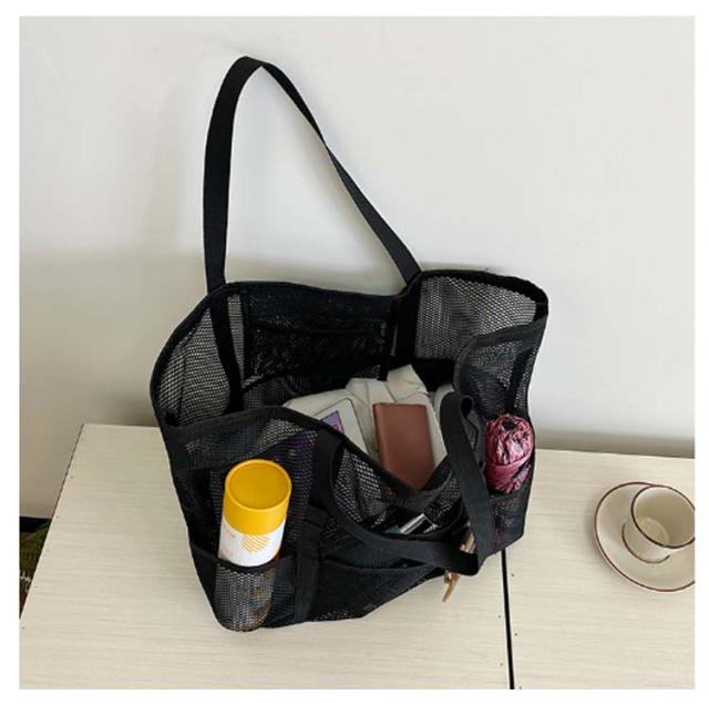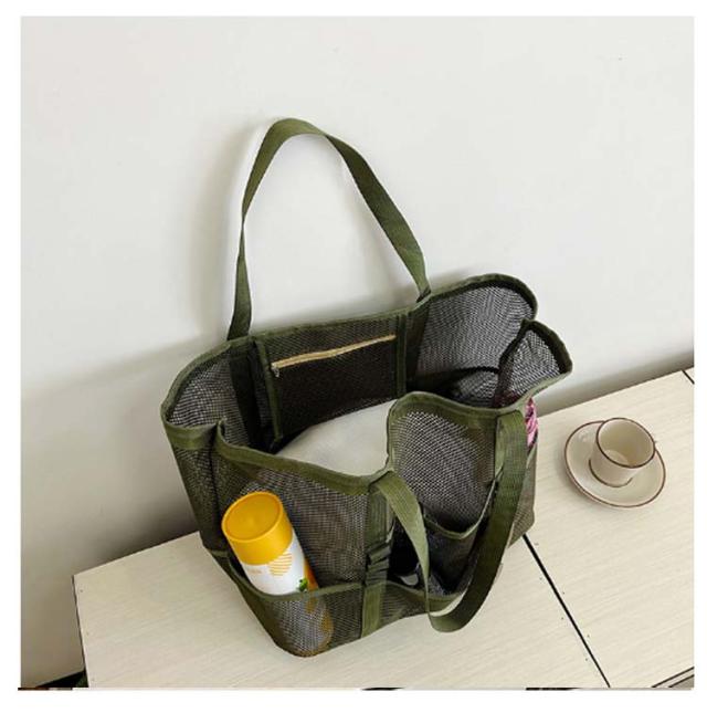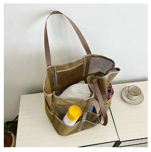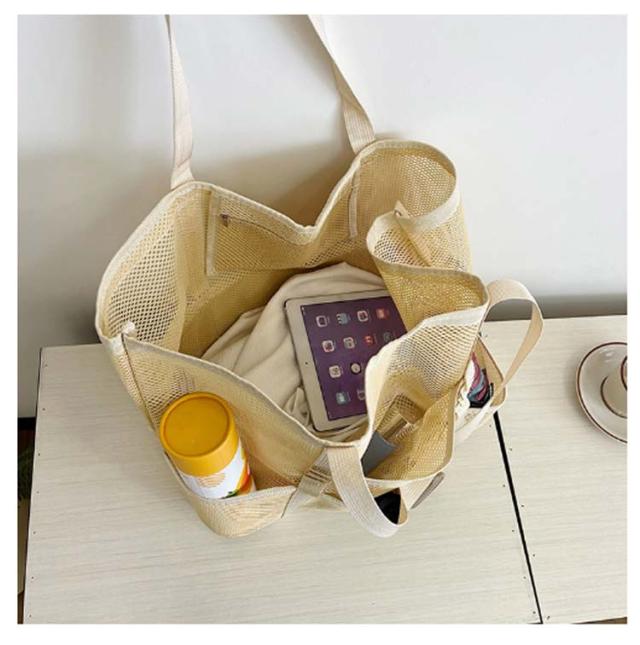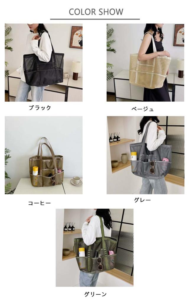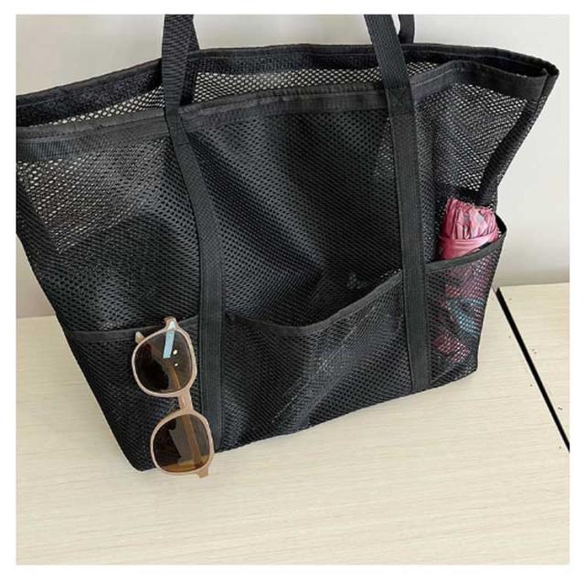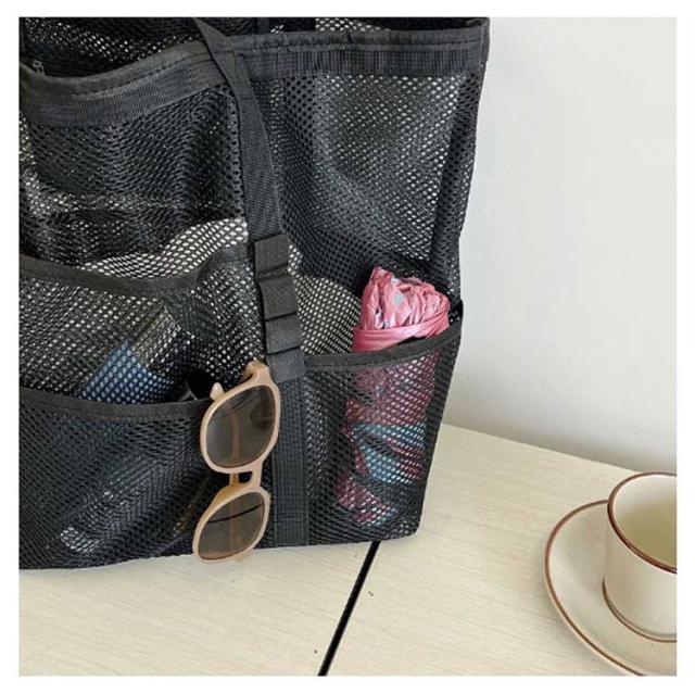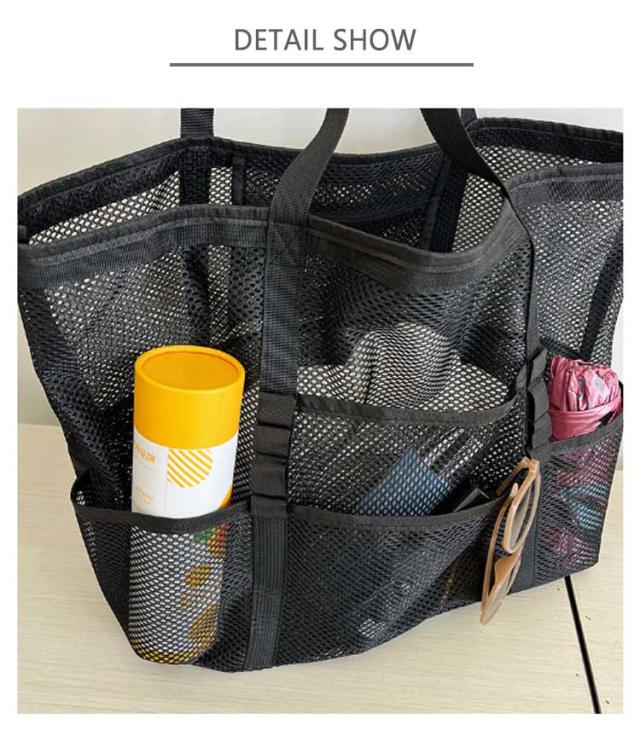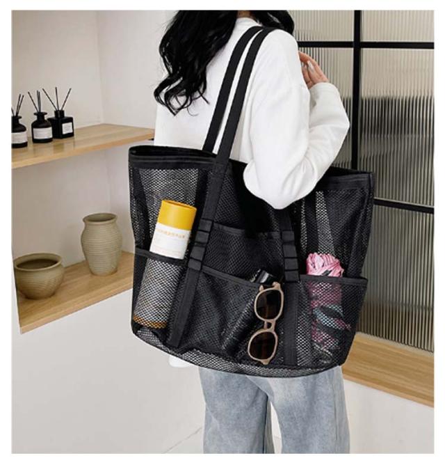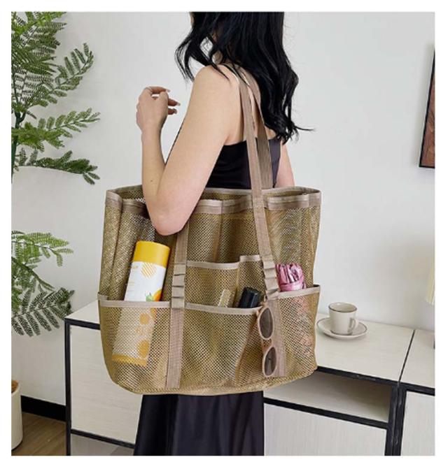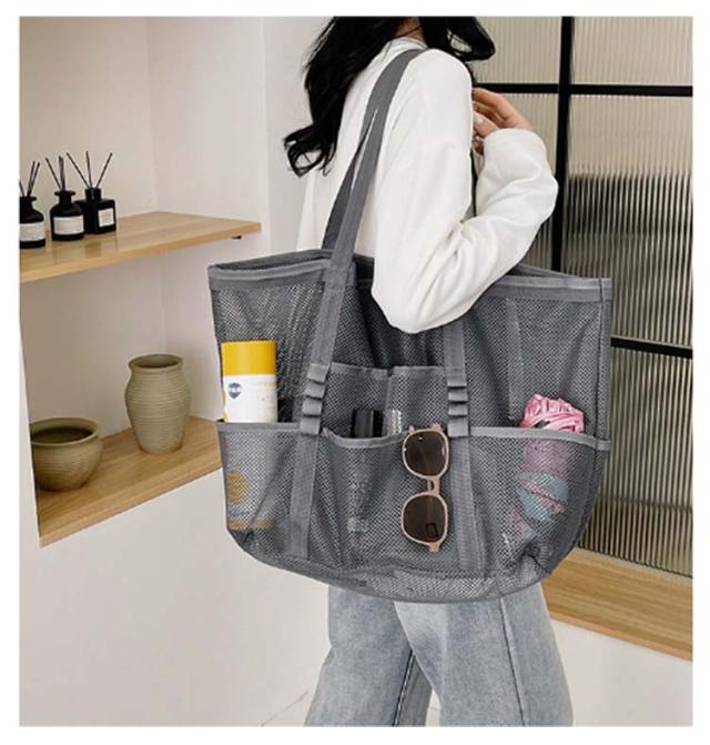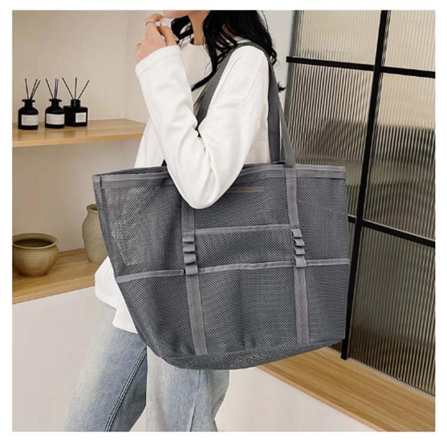 | 大容量のメッシュビーチバッグ。ポッケト多い!夏の陽気にぴったりのアイテム、大人女性に大好評の大容量メッシュビーチバッグが登場しました! ビーチでのリラックスタイムをさらに快適にするために設計されたこのバッグは、ビーチタオル数枚、ビーチマット、サンダル、マグボトル、日焼け止め、さらには衣類まで、ビーチで必要なものがすべて収納可能です。 大容量なのに、驚きの約210gの超軽量設計で、折りたたんでコンパクトに収納できるので、持ち運びもラクラク! 夏の強い日差しも気にせず、涼しいメッシュ素材で作られており、通気性抜群です。 | |
