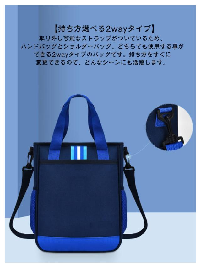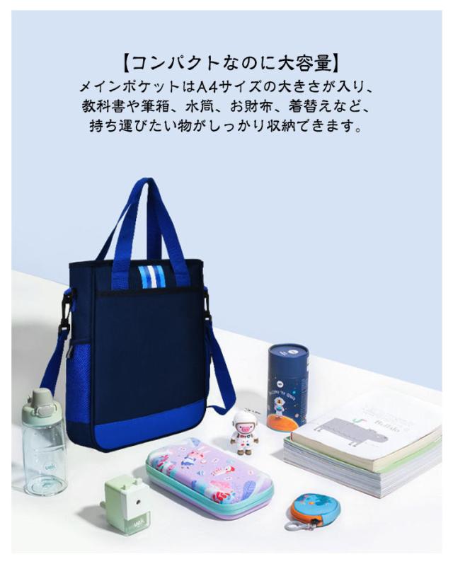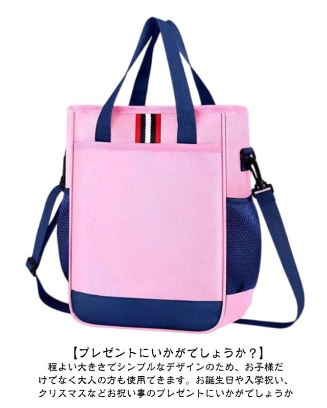 | 【持ち方選べる2wayタイプ】取り外し可能なストラップがついているため、ハンドバッグとショルダーバッグ、どちらでも使用する事ができる2wayタイプのバッグです。持ち方をすぐに変更できるので、どんなシーンにも活躍します。 【荷物が安定する縦型】しっかりした素材で縦に深いバッグです。荷物の中身を固定しやすく、中に入れた物が偏って出しにくかったり探す手間が少なくなります。メインポケットにはファスナーがついていて、中身が落ちる心配もいりません。 【使いやすいポケット付き】前面にポケット、サイドにはメッシュ素材のポケットが2つついています。よく使う小物を入れたり、サイドには飲み物や折りたたみ傘を入れたりと、小分けに収納できて取り出しやすいです! 【反射板付き】サイドに反射板付きの小さなタグがついています。夜間にカバンを使用する事があっても、反射板にライトが当たると光ってくれるため、夜道の歩行にも心強いです。 【コンパクトなのに大容量】メインポケットはA4サイズの大きさが入り、教科書や筆箱、水筒、お財布、着替えなど、持ち運びたい物がしっかり収納できます。 【撥水加工で雨の日も使える】撥水加工のナイロン生地を使用しているため、水に強く耐久性もあり丈夫です。万が一雨に濡れてしまっても中身が濡れてしまう心配はいりません。 【軽量で持ち運び楽ちん】カバンを持ち運ぶ際、お子様の負担にならず楽に使用する事ができます。長時間使用していても、疲れにくいです。 【色んなシーンで活躍】学校でのサブバッグとして使用したり、塾や習い事のレッスンバッグ、プライベートで使用したりと色んなシーンで活躍する便利なバッグです。 【プレゼントにいかがでしょうか?】程よい大きさでシンプルなデザインのため、お子様だけでなく大人の方も使用できます。お誕生日や入学祝い、クリスマスなどお祝い事のプレゼントにいかがでしょうか | |