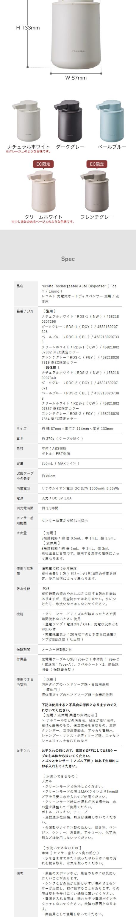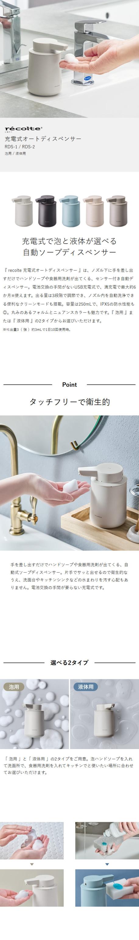[ recolte 充電式オートディスペンサー 泡用/液体用 ]【限定カラー】レコルト オートソープディスペンサー 自動 泡 液体 充電式 ハンドソープ 洗剤 洗面所 キッチン 台所 洗面 コンパクト おしゃれ かわいい シンプル ディスペンサー USB充電 食器用洗剤 防水 RDS-1 RDS-2