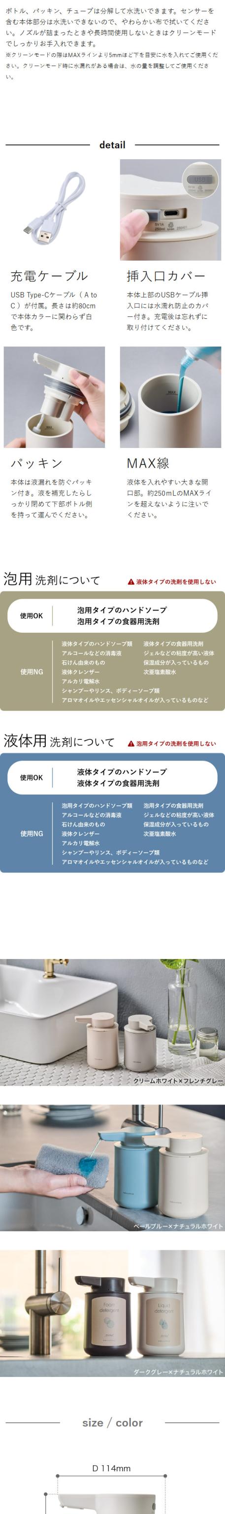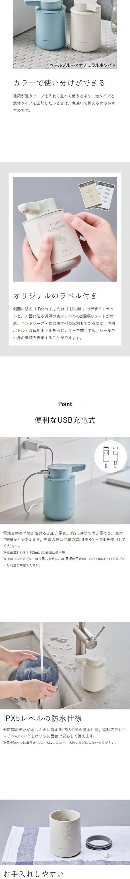 手を差し出すと洗剤が出てくる、センサー付きの自動ディスペンサー。電池交換の手間がないUSB充電式。丸みのあるフォルムとニュアンスカラーが魅力。泡用と液体用の2タイプをご用意。