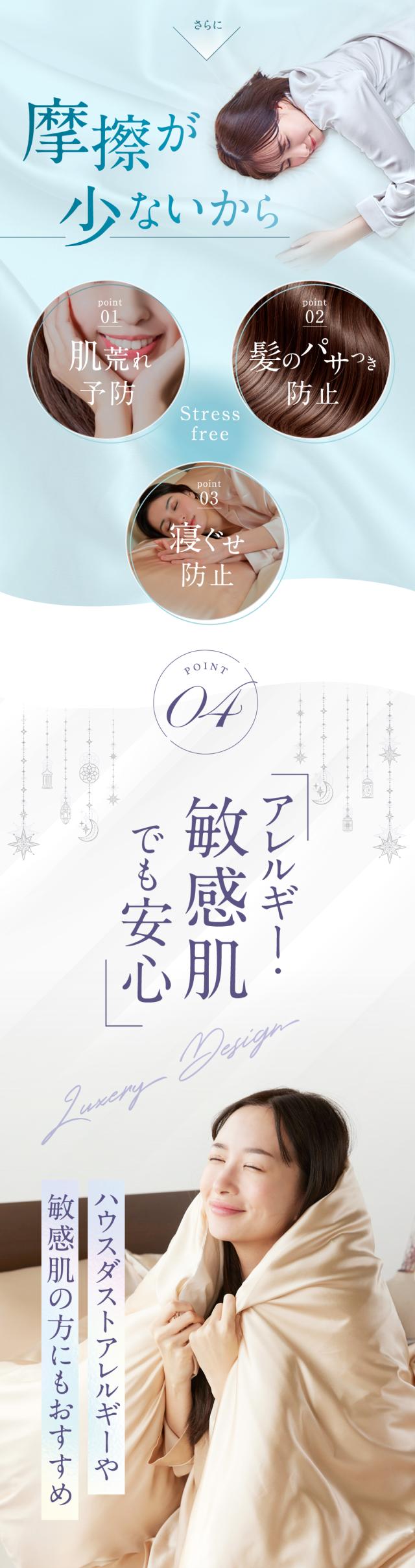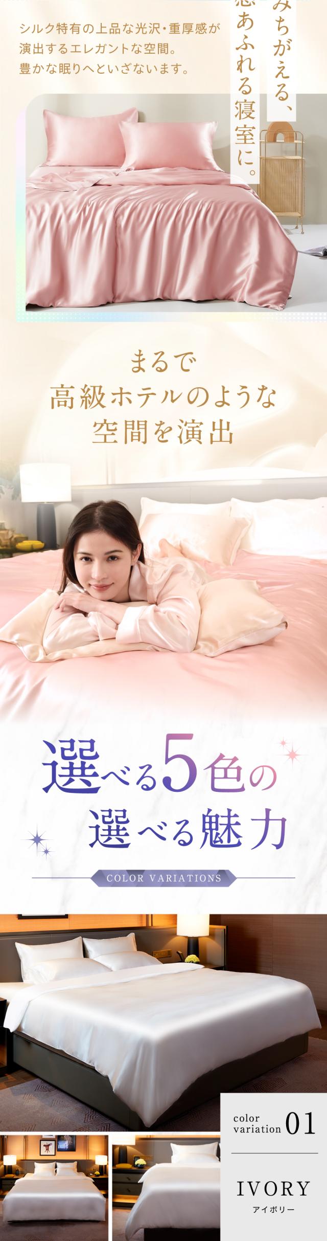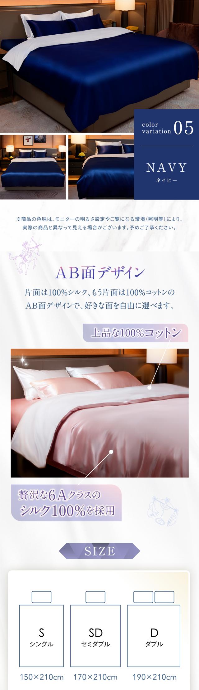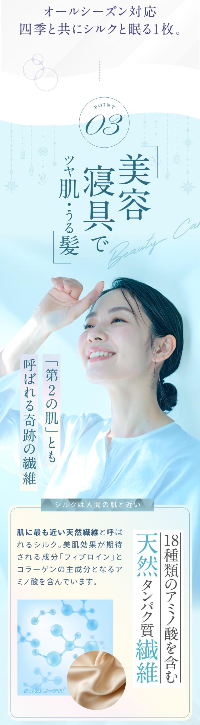 ・天然シルクの美肌・美髪効果 シルク面が摩擦を抑えて乾燥や寝汗を防ぎ、肌や髪をやさしく保護。寝ている間のスキンケア・ヘアケアをサポートします。 ・高い通気性と吸湿性 シルクの特性で汗や湿気を素早く吸収・放出し、蒸れにくく快適な寝心地が続きます。 ・冬は暖かく、夏はさらっと快適 シルクの保温性で冬もあたたかく、通気性で夏は涼しく。一年中快適に使えます。 ・敏感肌・アレルギー体質の方にも安心 天然素材だけを使用し、肌への刺激や静電気を抑え、デリケートなお肌でも心地よく眠れます。 ・表と裏で選べる快適性 片面は上質なシルクのとろけるような肌触り、もう片面は通気性のよいコットン。季節や気分に合わせて使い分けられます。 ・高級感あふれる上品な光沢 シルクならではの艶やかな質感が、寝室にラグジュアリーな雰囲気を演出します。 |