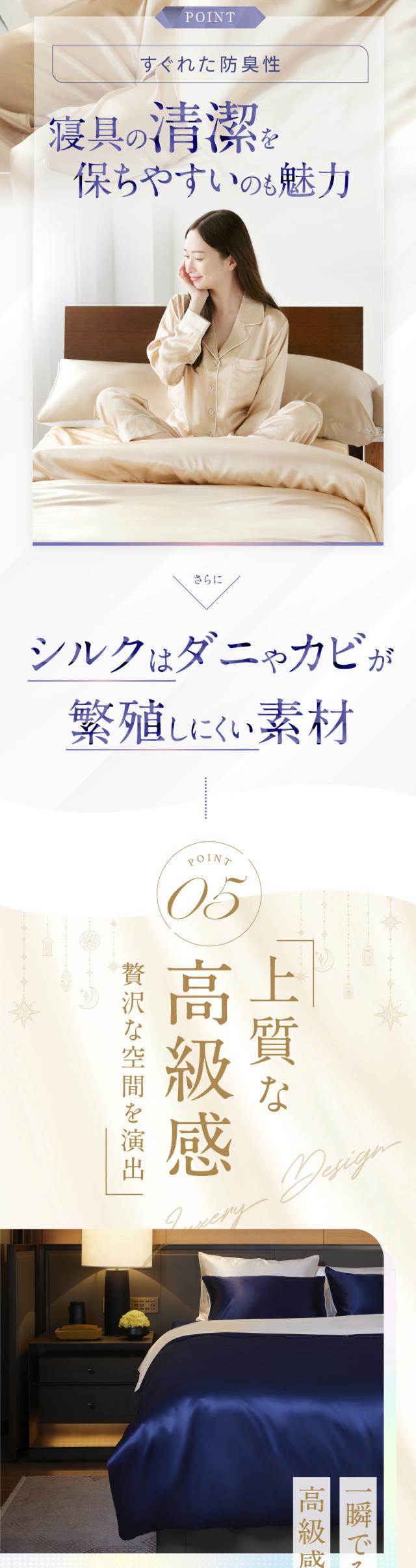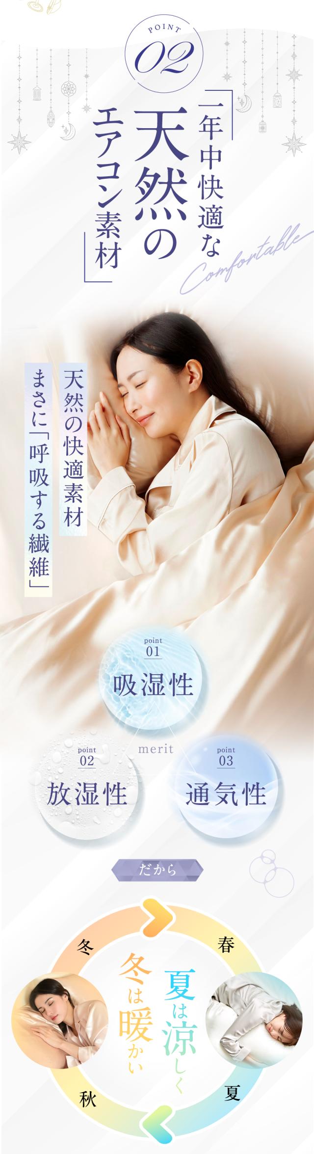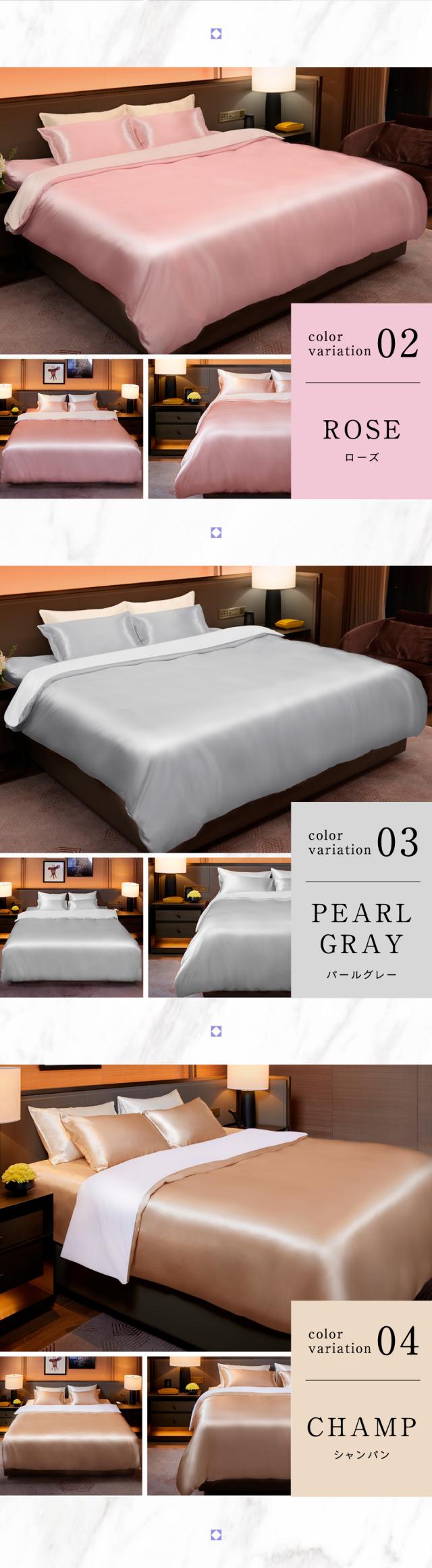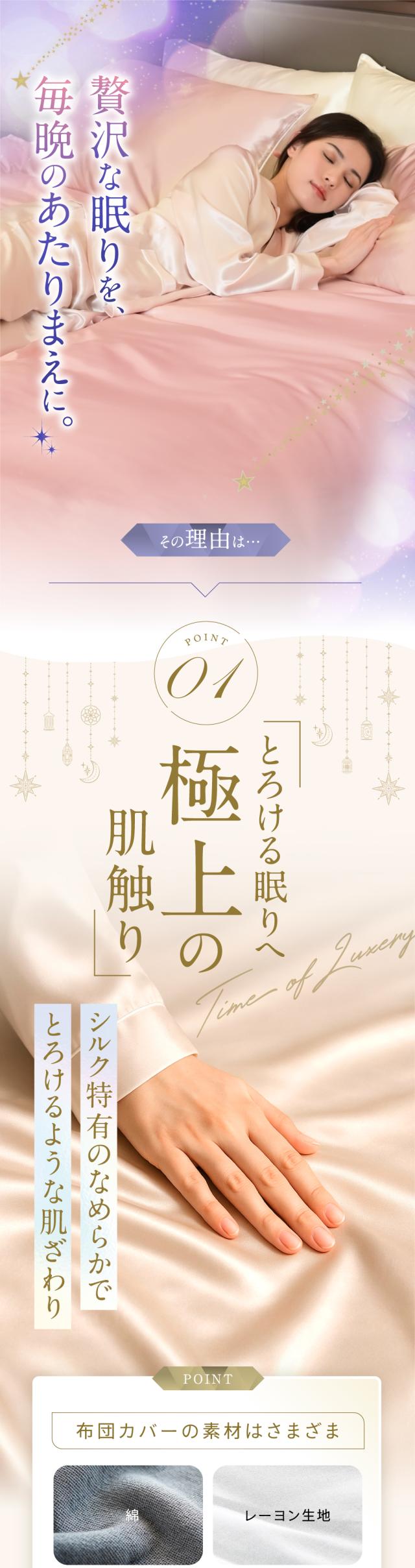・天然シルクの美肌・美髪効果 シルク面が摩擦を抑えて乾燥や寝汗を防ぎ、肌や髪をやさしく保護。寝ている間のスキンケア・ヘアケアをサポートします。 ・高い通気性と吸湿性 シルクの特性で汗や湿気を素早く吸収・放出し、蒸れにくく快適な寝心地が続きます。 ・冬は暖かく、夏はさらっと快適 シルクの保温性で冬もあたたかく、通気性で夏は涼しく。一年中快適に使えます。 ・敏感肌・アレルギー体質の方にも安心 天然素材だけを使用し、肌への刺激や静電気を抑え、デリケートなお肌でも心地よく眠れます。 ・表と裏で選べる快適性 片面は上質なシルクのとろけるような肌触り、もう片面は通気性のよいコットン。季節や気分に合わせて使い分けられます。 ・高級感あふれる上品な光沢 シルクならではの艶やかな質感が、寝室にラグジュアリーな雰囲気を演出します。 |