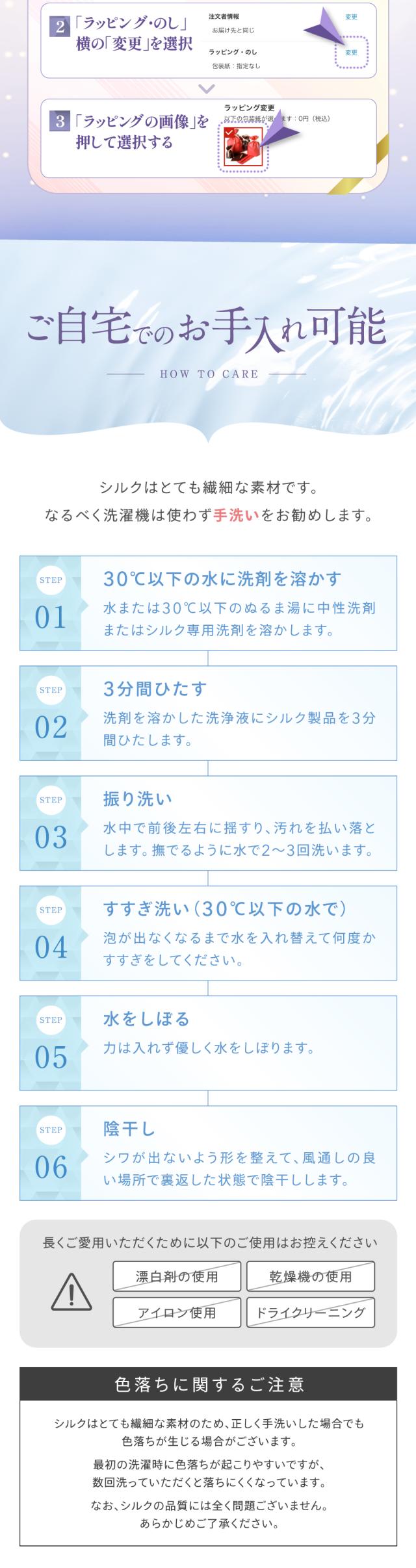 | お手入れ方法 | シルク100%のため、できるだけ手洗いをしてください。 (1)ぬるま湯(30℃以下)に中性洗剤を溶かし、やさしく押し洗いしてください。 (2)洗剤が残らないよう、きれいな水でやさしくすすぎます。 (3)軽く押さえるようにして水気を取り、タオルに包んで軽く水分を吸い取ります。 (4)直射日光を避け、風通しのよい日陰で平干ししてください。 (5)必要な場合は当て布をし、低温(110℃以下)で軽くアイロンをかけてください。 |