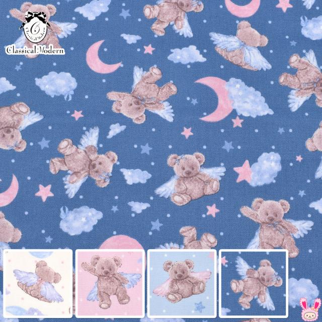 クラシカルモダン(Classical Modern)シリーズから登場した、天使になったテディベアが空をふわふわ飛んでいる、可愛いゆめかわデザインのオックス生地です。羽をつけたキュートなクマたちが、月や星、雲の浮かぶお空を楽しそうに楽しそうに舞っている絵本のような世界観が広がっています。ドット柄やリボン(りぼん)など、キュートでフェミニンなモチーフがぎゅっと詰まっていて、ガーリーな雰囲気がたっぷり。扱いやすいコットン素材のオックス生地は、バッグやポーチ、キッズ向けアイテム、インテリア雑貨など幅広いハンドメイド作品にぴったり。くま好きさんや、ゆめかわ・ガーリーなテイストがお好きな方に特におすすめです。