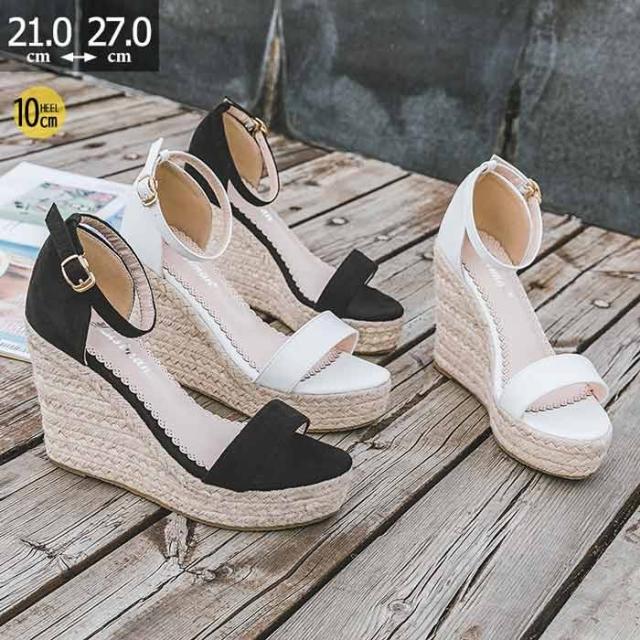 ウェッジソール サンダル 厚底 レディース 小さいサイズ かわいい オシャレ 脚長 ヒール10cm リゾート 美脚 カジュアル 靴 大人 軽量 歩きやすい 夏用 普段履き 21.0-27.0 ブラック/オフホワイト