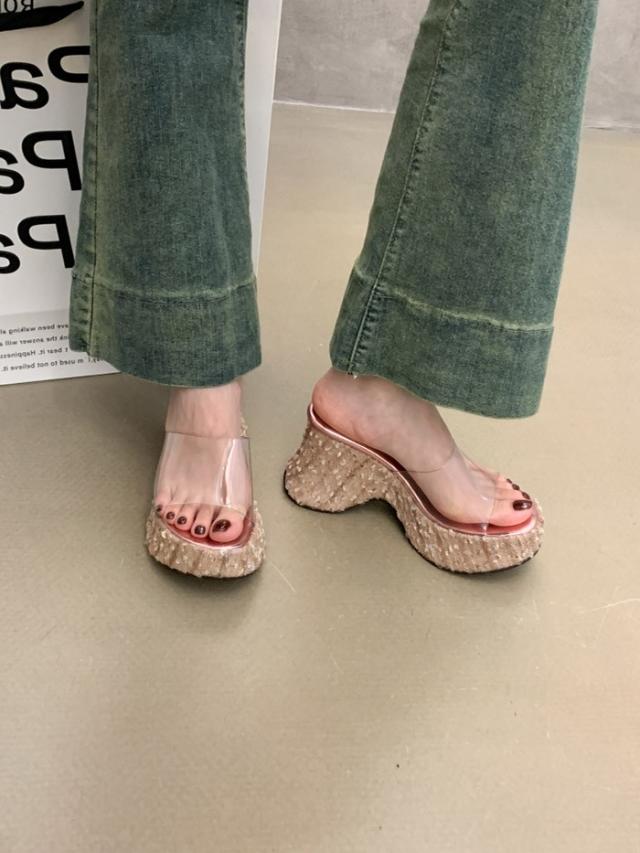 サンダル レディース 厚底 クリアサンダル 厚底サンダル ウエッジソール ウェッジソール ミュール 可愛い キラキラ ピンク ブラック 黒 シルバー 小さいサイズ 22.5-24.5 ヒール6cm オシャレ ヒールサンダル ストーム 春 夏 靴 女性 大人 つっかけ シューズ