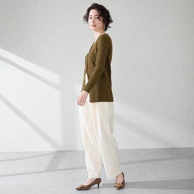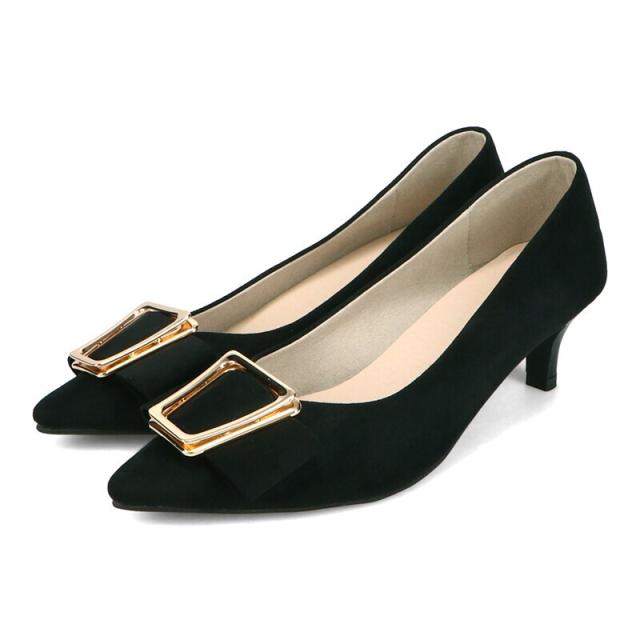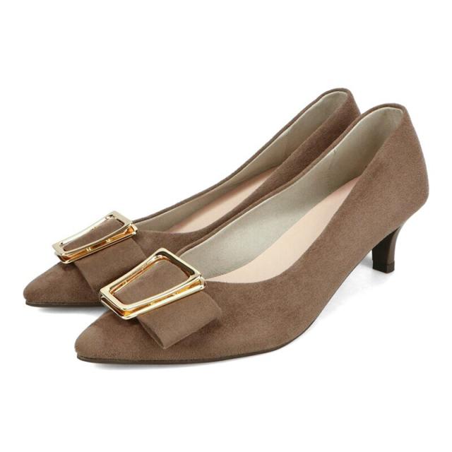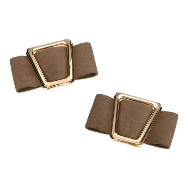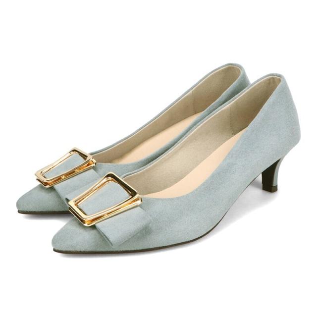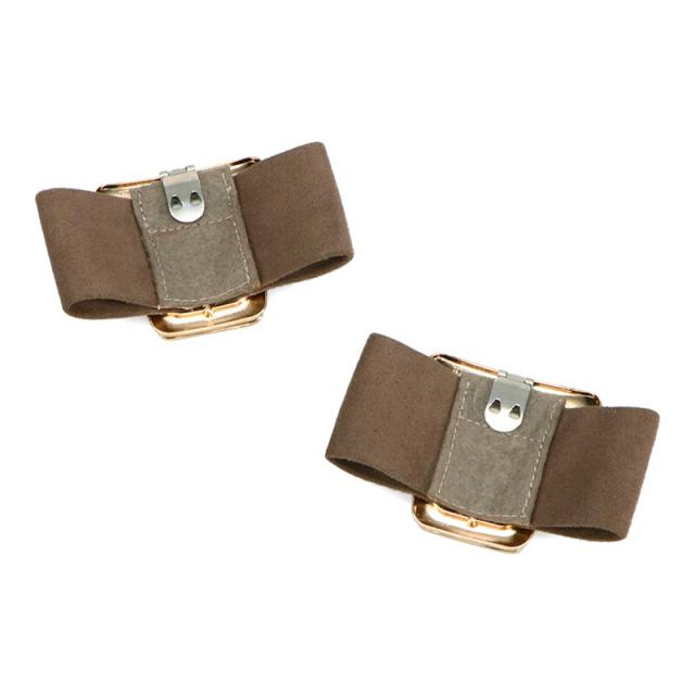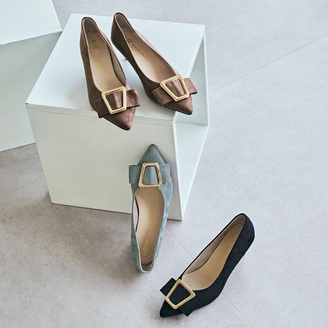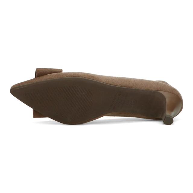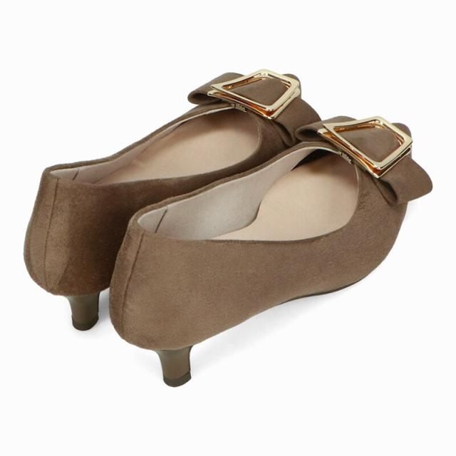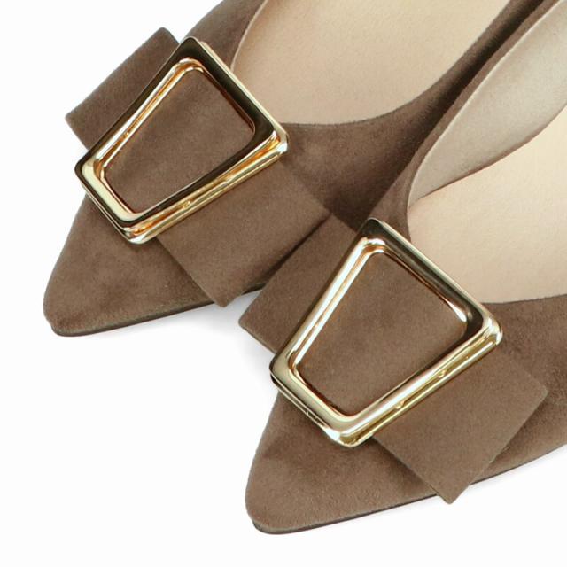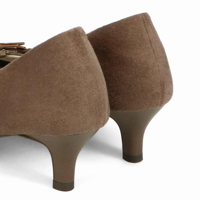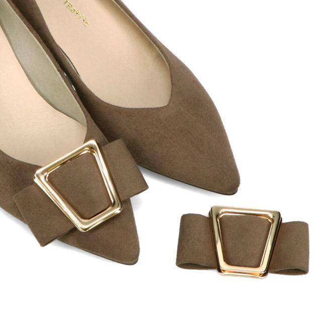シャープなポインテッドトゥに華奢なヒールが女性らしさを引き立たせてくれるパンプス。クリップ式で付け外しが可能な大ぶりのモチーフは、リボン×ゴールドの組み合わせで上品な印象に。つま先や中敷にクッションを入れることでヒールでも歩きやすさを考えられた作り。足に馴染むスエード素材と、シーンによって使い分けできるデザインで幅広く使える1足。