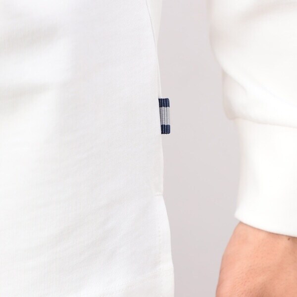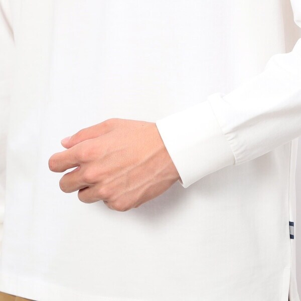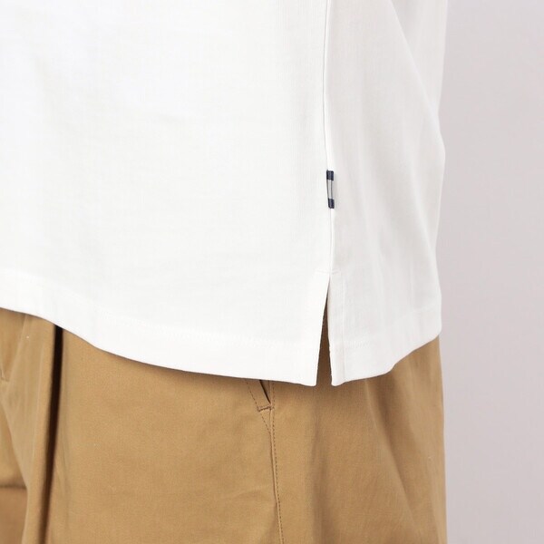 衿ぐりが伸びずらいダブルステッチの仕様や、左脇に挟んだストライプテープと脇スリットがポイントです。