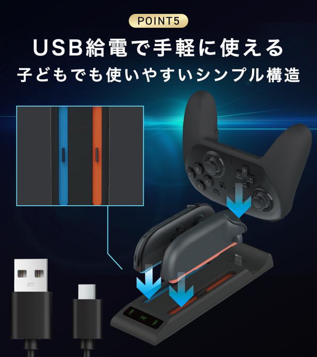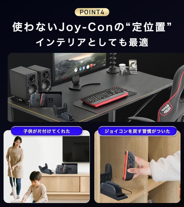 【 優れた5つのポイント 】 (1) 3台一度に充電できる (2) LEDライトで充電完了が一目でわかる (3) コントローラーを保護するチップ付き (4) 超薄型&場所をとらずインテリアにもOK (5) USB給電&簡単構造で子どもでも使える 【 3台一度に充電 】 2つのJoy-Conと1つのプロコンを一度に充電できるから、みんなで遊ぶときもバッテリー切れ知らず! 【 色でわかる充電状態 】 充電中は赤、満タンは緑のLEDで、一目でどのコントローラーが充電できているかわかります。 【 安心の保護チップ付き 】 過電圧・過電流・短絡から守るチップが内蔵されていて、コントローラーのバッテリーを長持ちさせます 【 薄くてスッキリ収納 】 とても薄くて場所をとらないから、テレビ横に置いてもインテリアになじみやすい 【 USBでかんたん&やさしい設計 】 USB電源で使えて、Joy-Conはスライドするだけ。子どもでも迷わず使えるシンプル構造です。 |