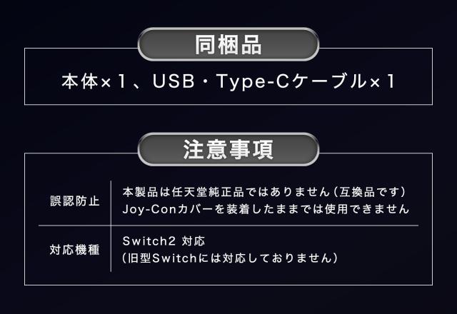 | セット内容 | Switch2 ジョイコン2 専用 充電器 黒 / Type-C充電ケーブル / 各1個 |
