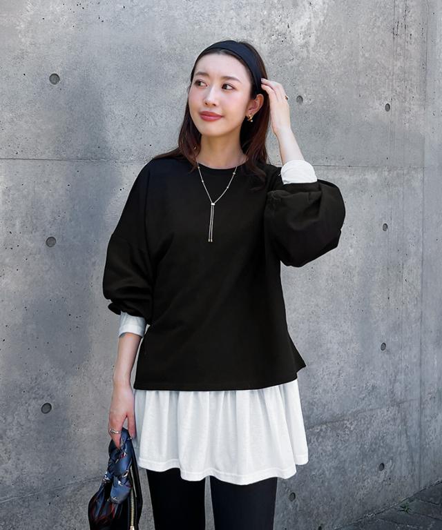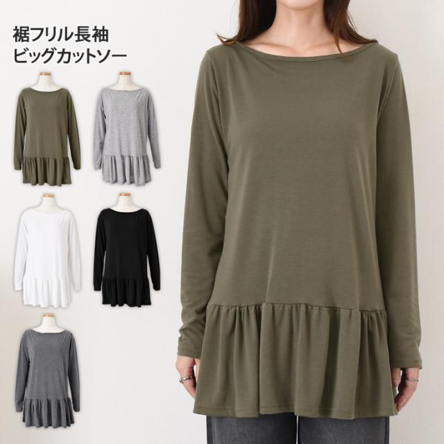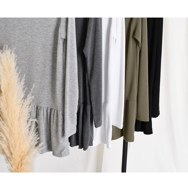 新作 裾フリル長袖シンプルビッグカットソー レディース きれいめ トップス Tシャツ 薄手 秋 ゆったり 裾フレア ペプラム チュニック 大きいサイズ カジュアル 可愛い 無地 ワイド 重ね着 レイヤード デイリー