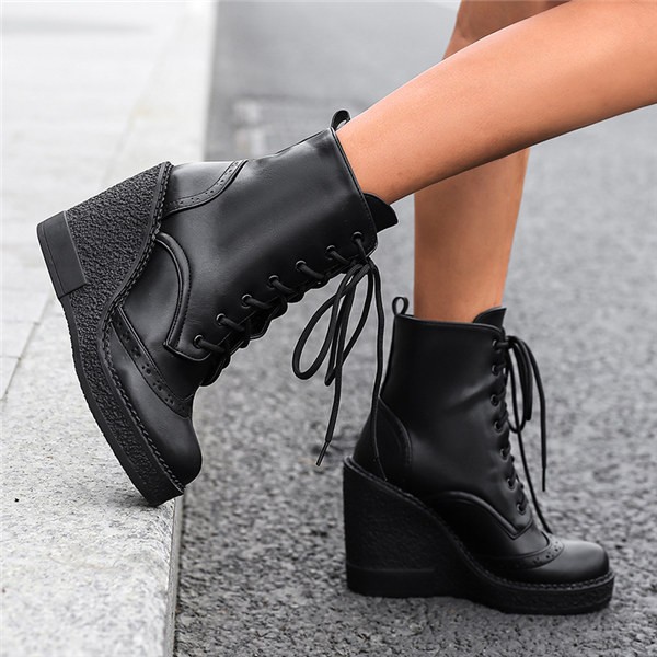 ショートブーツ レディース 歩きやすい 滑らない 痛くない ウェッジソール カジュアル 防滑 防寒 黒 厚底 編上げタイプ レースアップ 美足 秋冬 PU 韓国 黒 ブラウン 通勤 大人 22.2-24.5