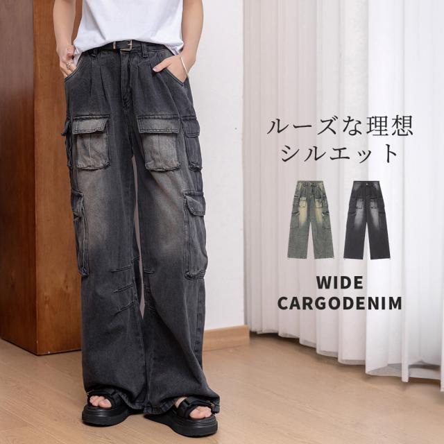 「ローライズでウエストとの対比」ワイドパンツ ストレート デニム ボトムス レディース ゆったり タックパンツ ポケット ボタン ファスナー ベルトループ ウォッシュ加工 ヴィンテージライク 中厚手 無地 韓国ファッション 黒 春 秋冬
