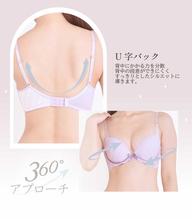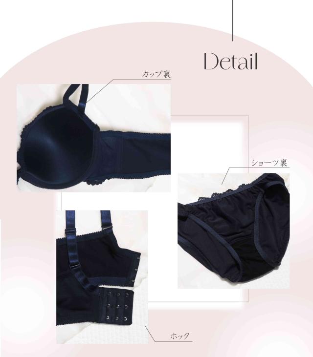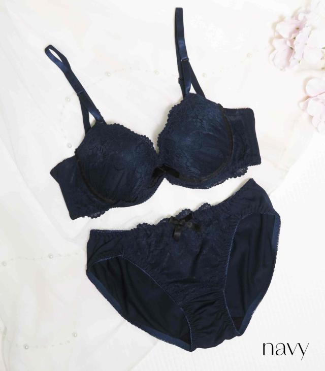 繊細なレースとアンダー部分のリボンがかわいいブラセット。落ち着きのあるバイカラーが上品な大人の雰囲気を醸し出します。真ん中のリボンがオシャレポイント。セットショーツは安心なフルバックタイプ。ブラは脇高仕様で脇肉をカップに流し込み、美しいボディーラインをメイクします。カラーは清楚なパープルとネイビーの2色展開です。