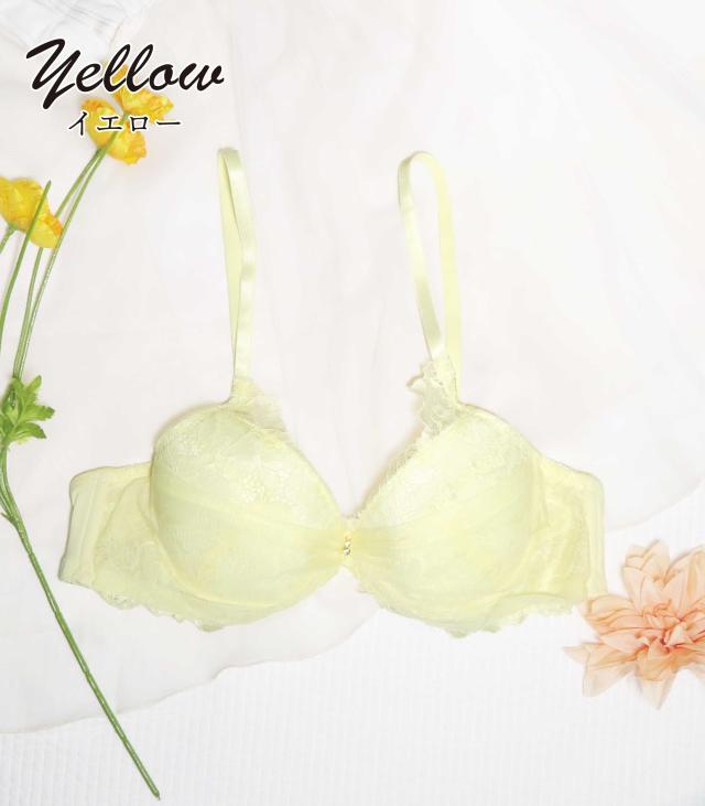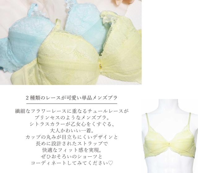 繊細なフラワーレースに重なるチュールレースがプリンセスのようなメンズブラ。シトラスカラーが乙女心をくすぐる大人かわいい一着。カップの丸みが目立ちにくいデザインと、長めに設計されたストラップで快適なフィット感を実現。ぜひお揃いのショーツと合わせてコーディネートしてみてください。