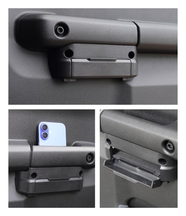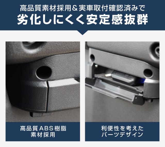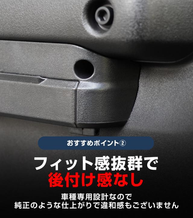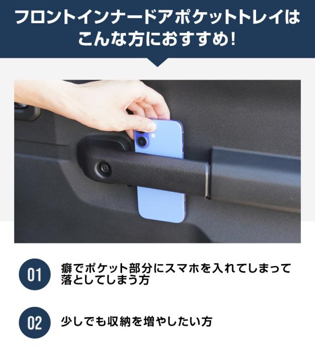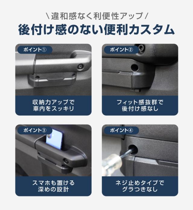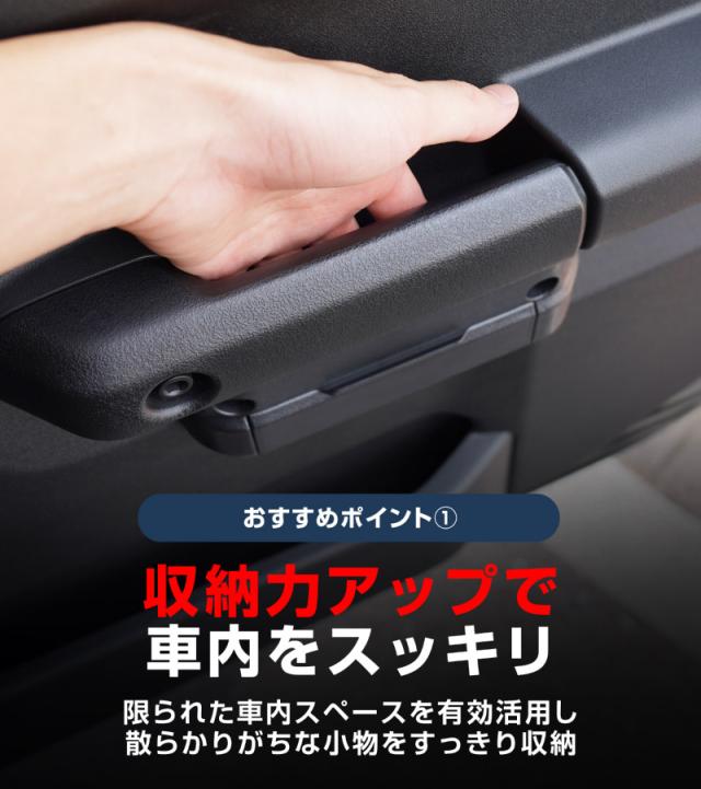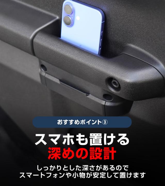 収納の少ないジムニーの室内空間を有効活用できるアイテムで、スマホや駐車券などの小物をすっきりと収納できます。十分な深さと強度があり、走行中も安心の安定感。ドアポケットとして使い勝手がぐんと向上します。