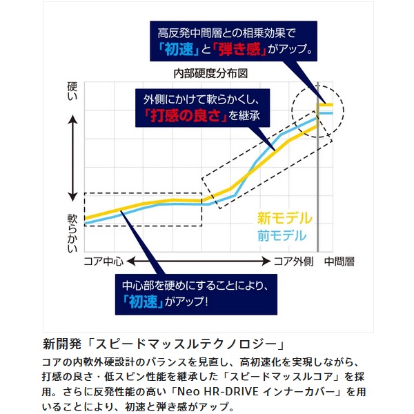 新開発のスピードマッスルテクノロジーが、ゴルフボールの効率的な「つぶれ」と素早い復元による「弾き」を進化させる。