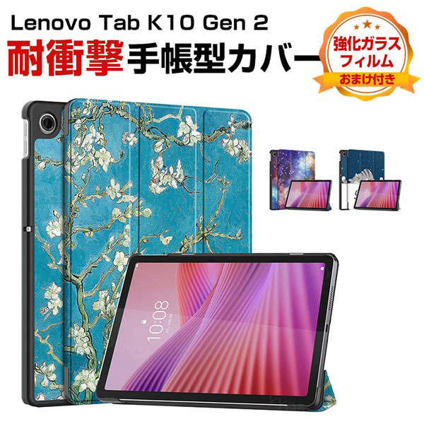 レノボ Lenovo Tab K10 Gen 2 (2nd Gen) 10.1インチ ZAEK0002JP/ZAEL0018JP ケース 耐衝撃 カバー PC+PUレザー製 オートスリープ機能 便利 実用 人気 持ちやすい 汚れ防止 スタンド機能 カッコいい 手帳型カバー タブレットケース 強化ガラス付き