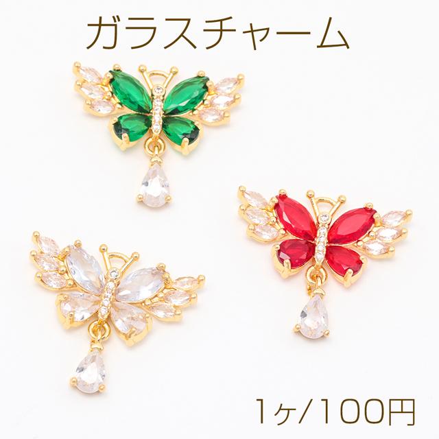 ガラスチャーム フラワー 羽ばたく蝶々 揺れるしずく ストーン付き 可憐 メタルチャーム 約20×23mm(1ヶ)